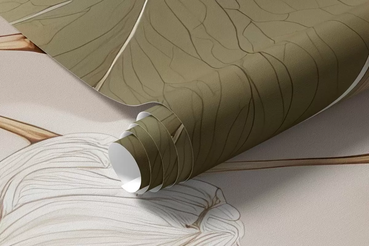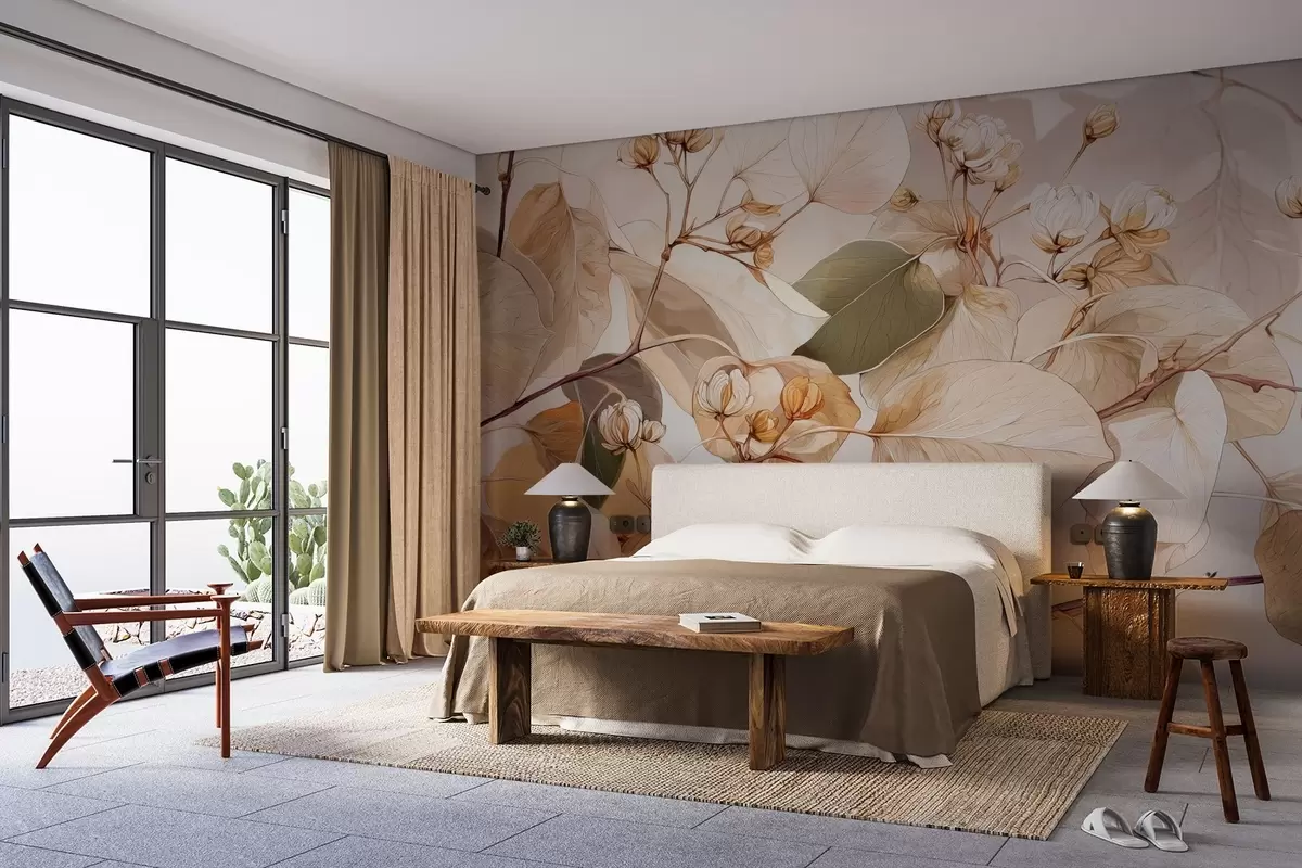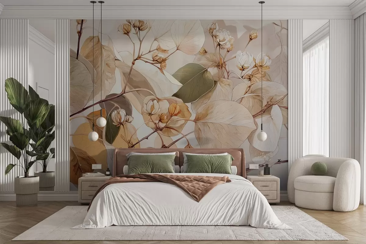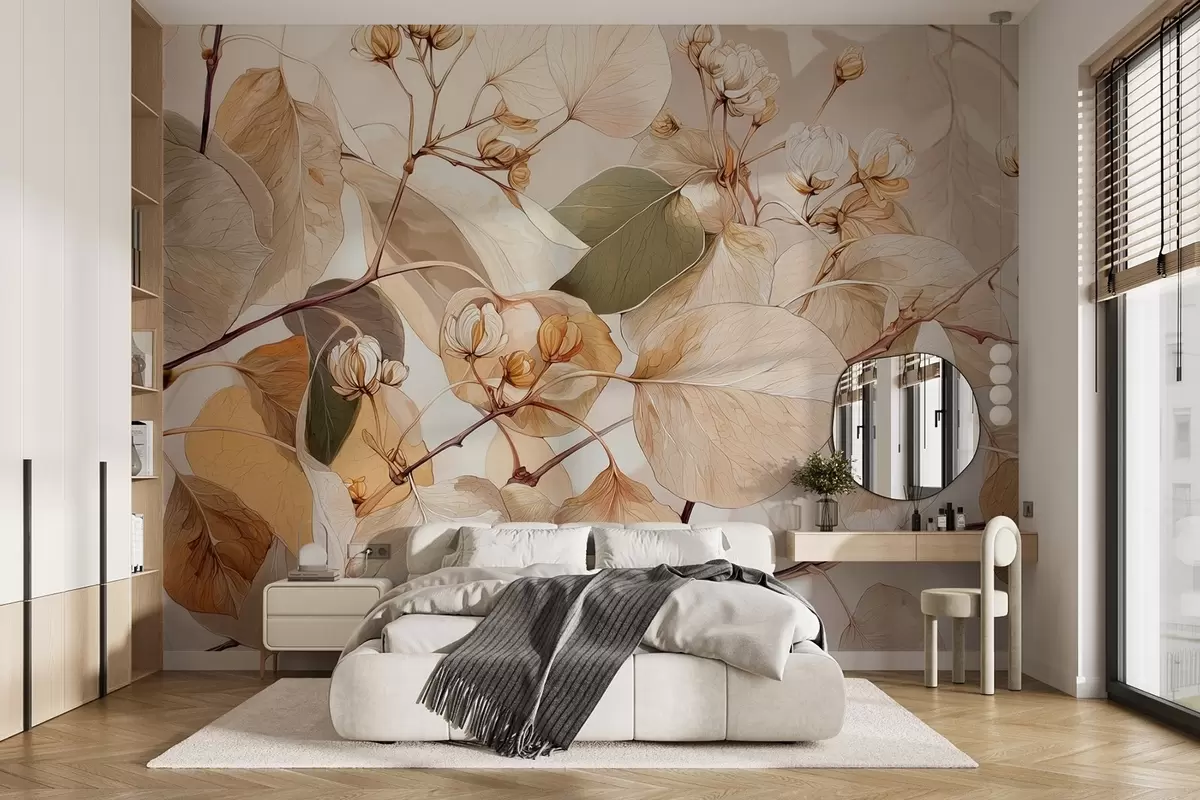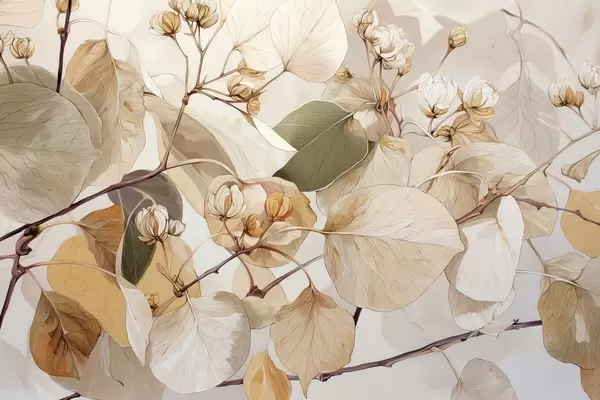 Papel de pared Ramas de hojas y flores de álamo temblón al óleo en tonos beige Nr. w09082