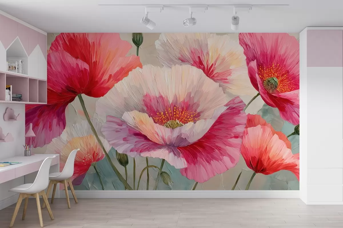 Papel de pared Amapolas blancas y rojas al óleo con pinceladas atrevidas Nr. w09097