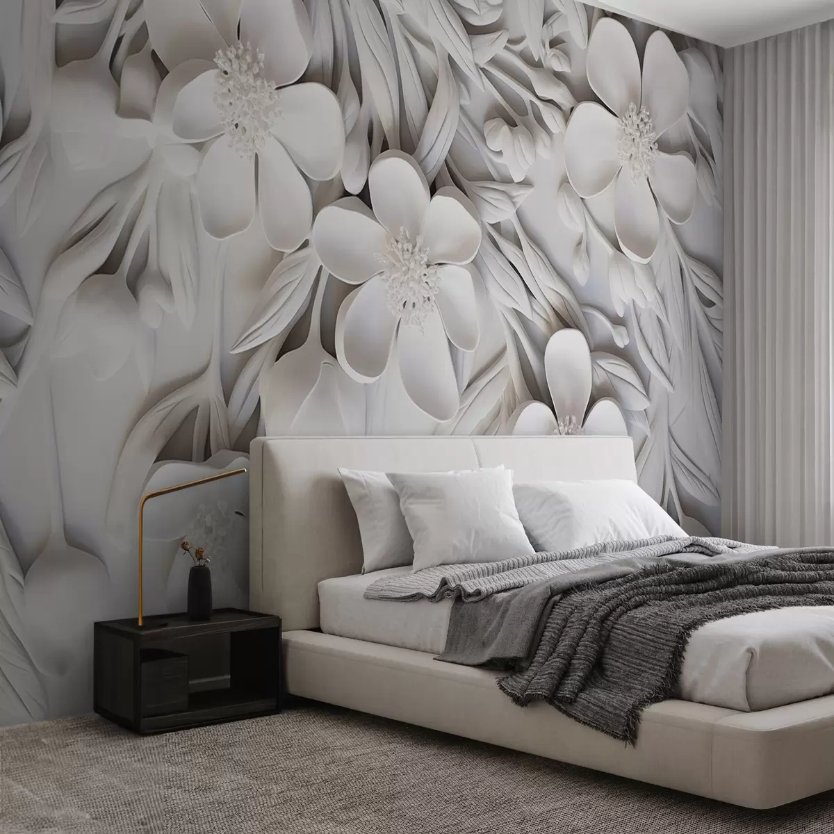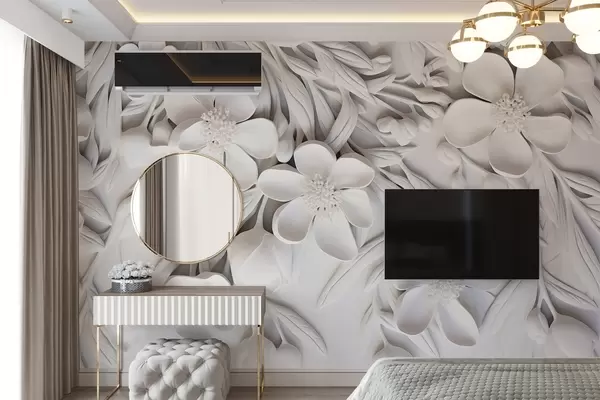Papel de pared Flores blancas y hojas en un fondo blanco, floral elegante, diseño decorativo, detalles intrincados Nr. w09113