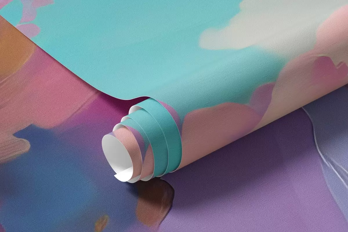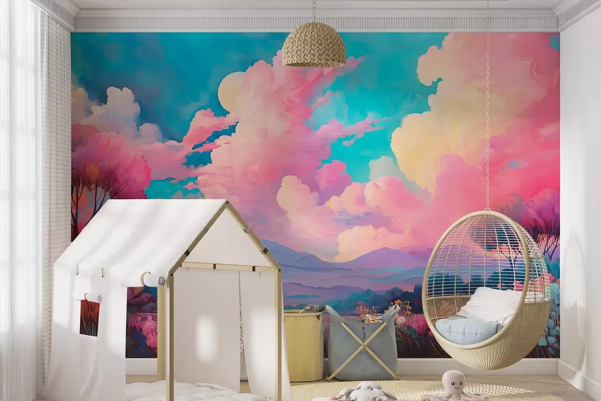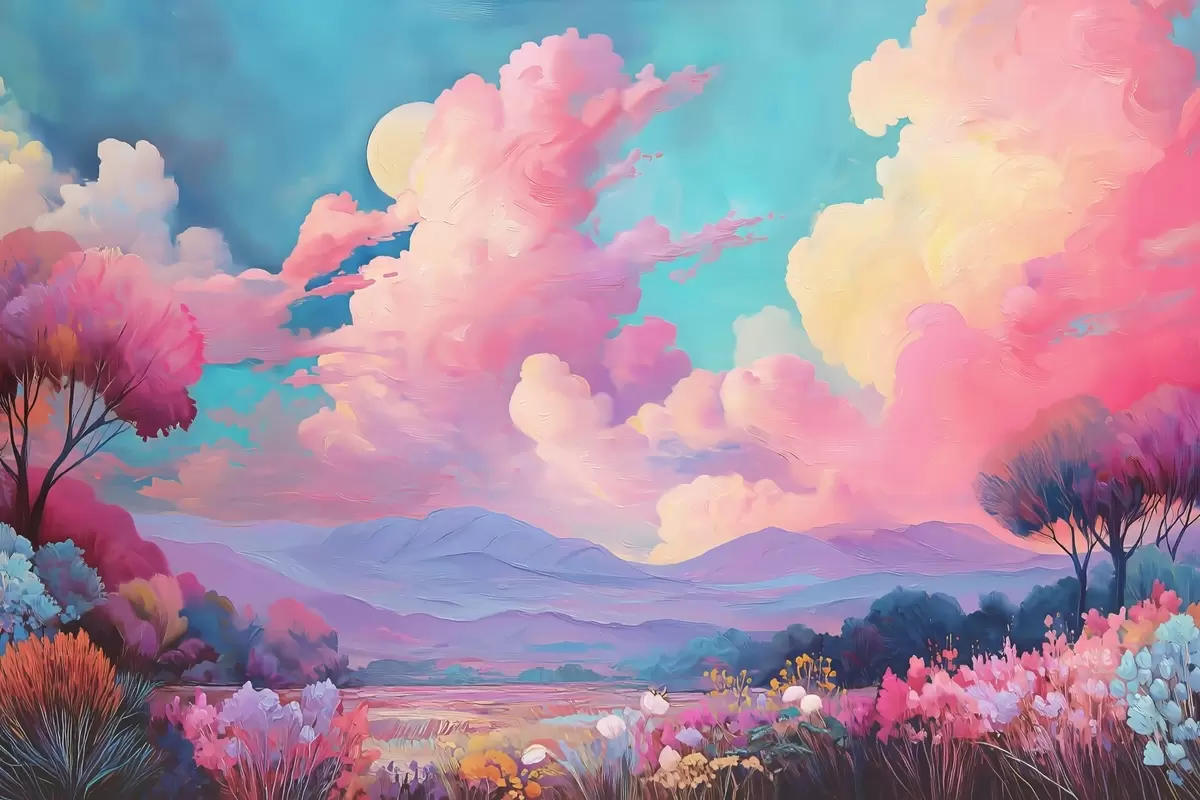 Papel de pared Colorido paisaje al óleo con cielo rosa, plantas y árboles Nr. w09123