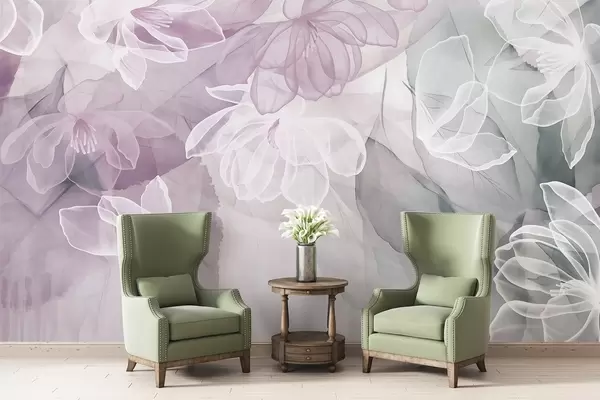 Papel de pared Flores y hojas con pétalos transparentes en tonos blancos, rosas y verdes, suaves y delicados Nr. w09158v1