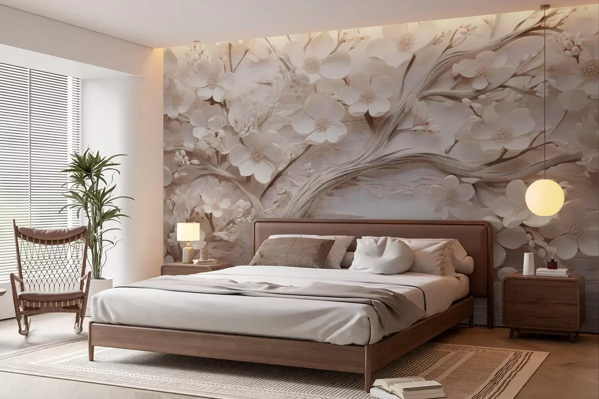 Papel de pared Árbol texturizado con flores blancas y tronco marrón, el fondo es blanco con líneas horizontales iluminación suave Nr. w09166