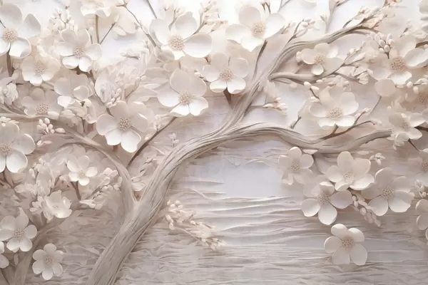 Papel de pared Árbol texturizado con flores blancas y tronco marrón, el fondo es blanco con líneas horizontales iluminación suave Nr. w09166