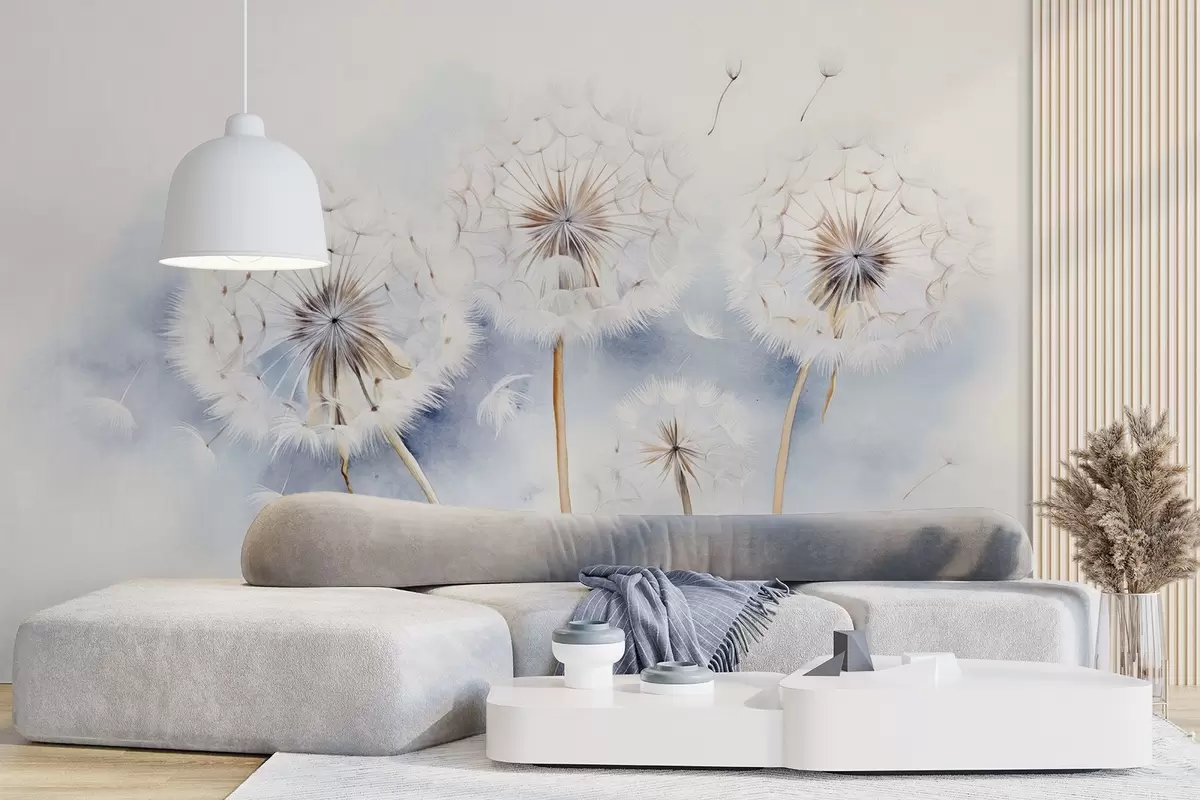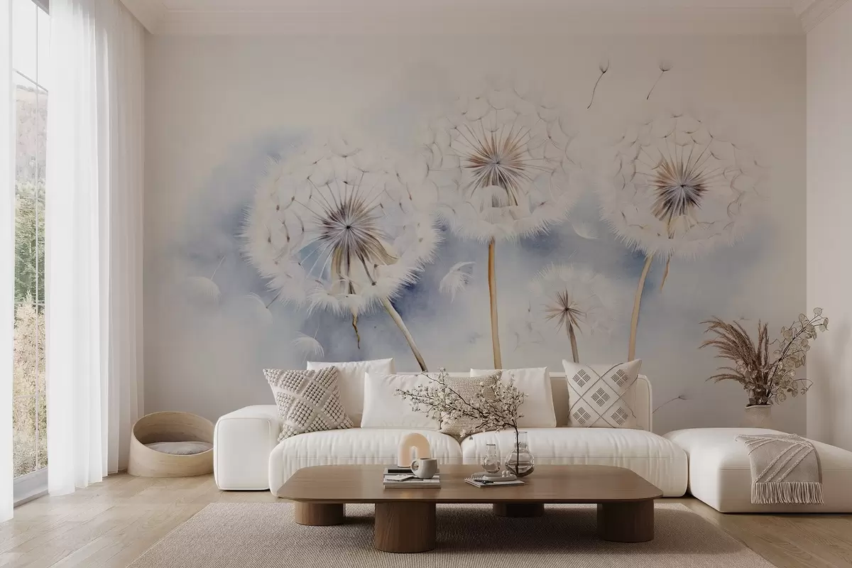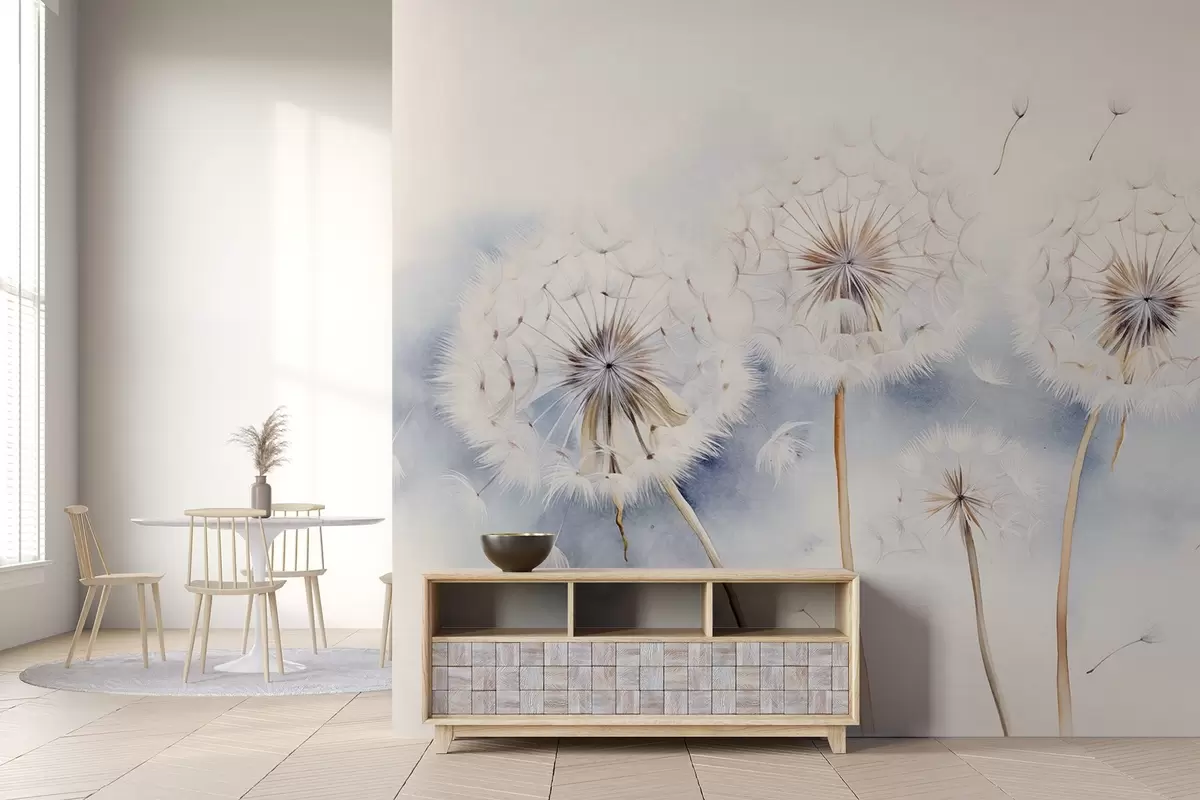Papel de pared Dientes de león texturizados con semillas flotando en el aire, fondo azul claro y blanco, estilo de dibujo suave y delicado Nr. w09190