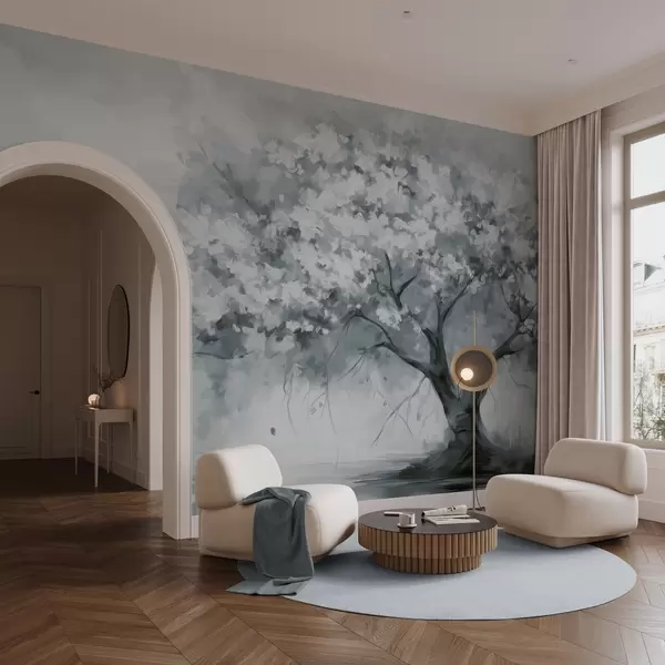 Papel de pared Abstracto árbol en flor azul apagado en plena floración, junto a un río, pinceladas de textura suave y colores pastel Nr. w09193v2