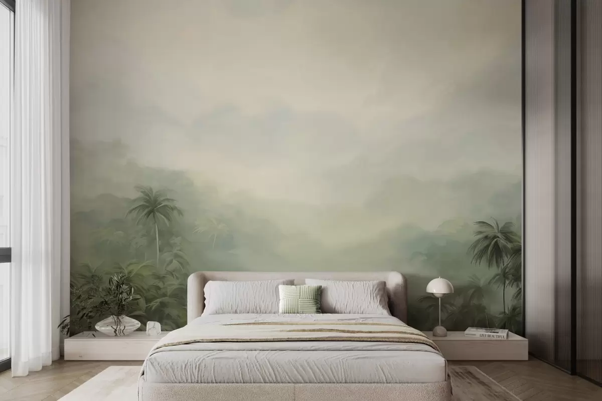 Papel de pared Paisaje selvático con exuberantes palmeras verdes y colinas ondulantes , colores pastel suaves, imitación pintura texturizada Nr. w09194