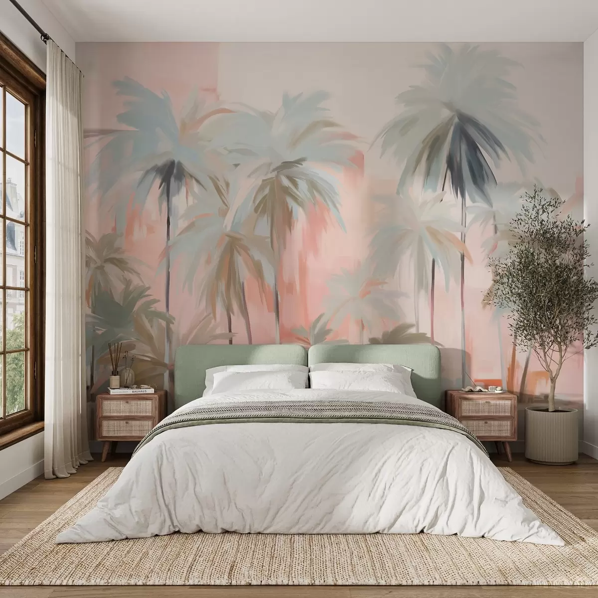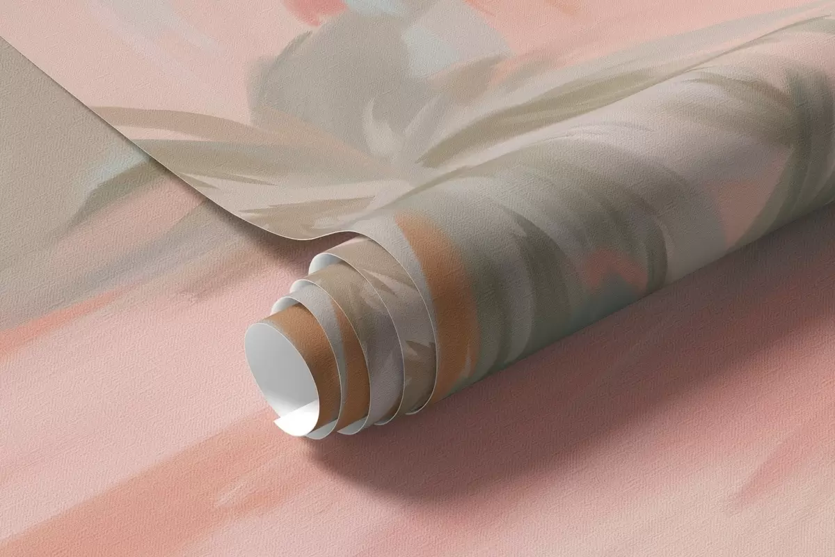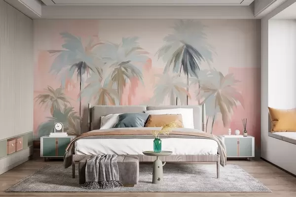 Papel de pared Palmeras tropicales abstractas minimalistas en tonos pastel, sobre un fondo de suaves tonos rosa y melocotón Nr. w09212