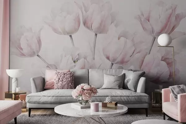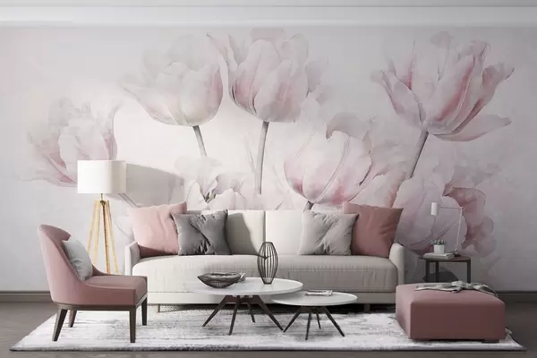 Papel de pared Tulipanes de textura rosa con hojas verdes, luz suave, estilo acuarela vintage, pinceladas delicadas Nr. w09220
