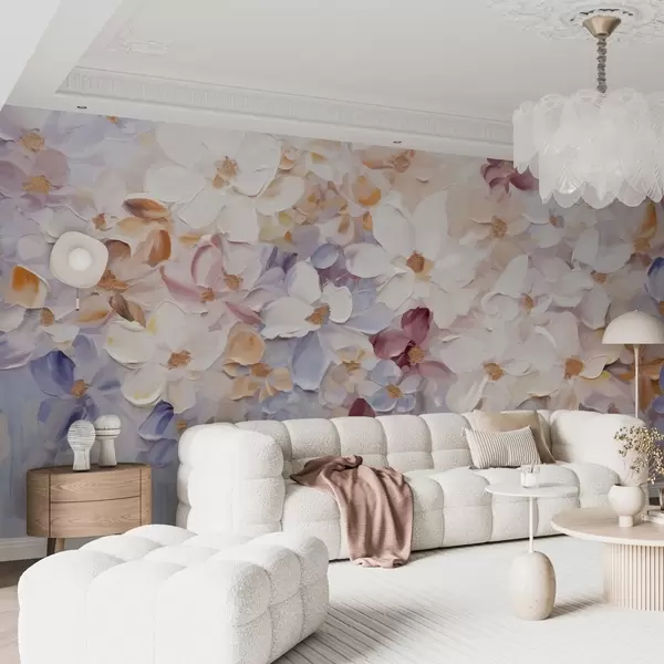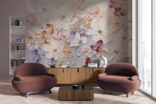 Papel de pared Pintura al óleo imitación de un jardín de flores con flores blancas, rosas y naranjas, pinceladas suaves, colores pastel apagados Nr. w09236