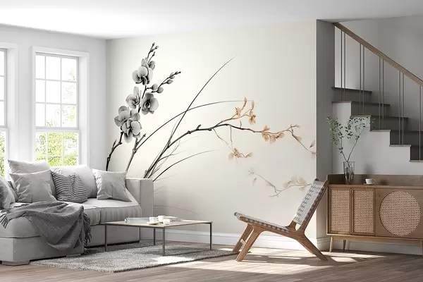 Papel de pared Rama de orquídea minimalista en suaves tonos sepia y grises Nr. w09250