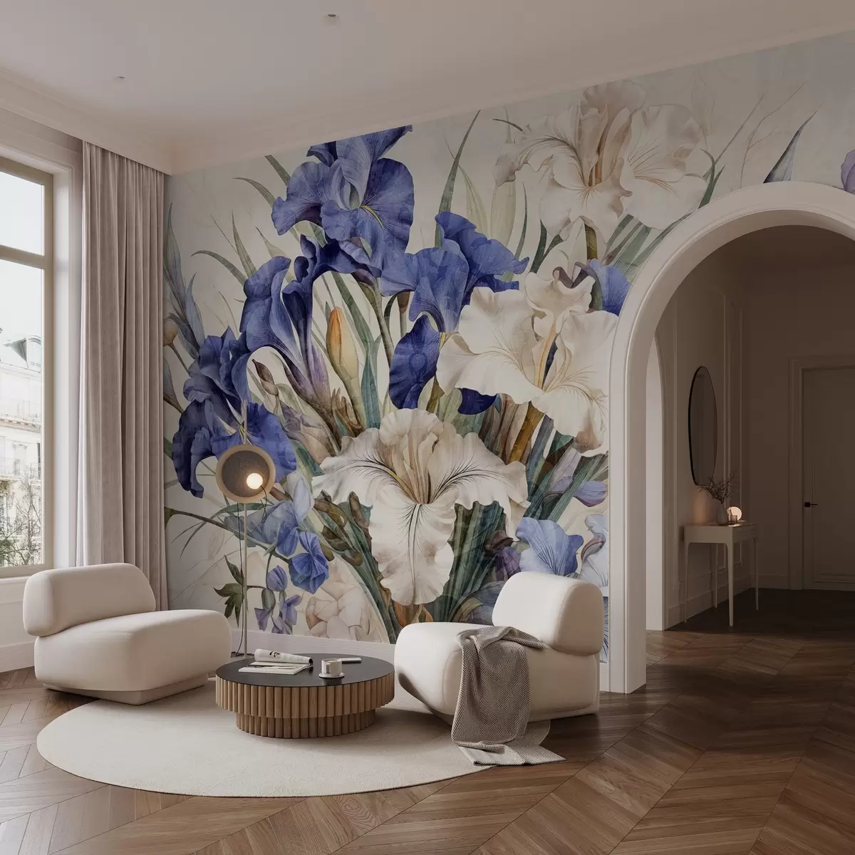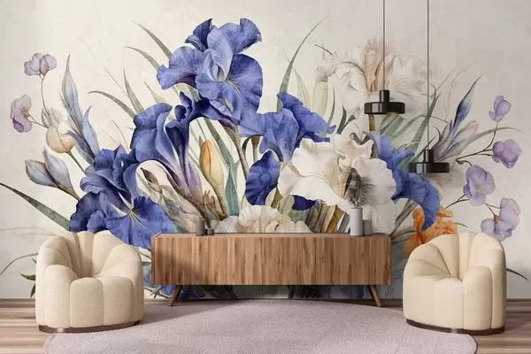 Papel de pared Ramo con textura vintage de lirios morados, dispuestos con hojas y tallos verdes, sobre un fondo suave Nr. w09263