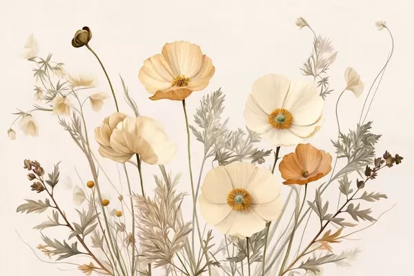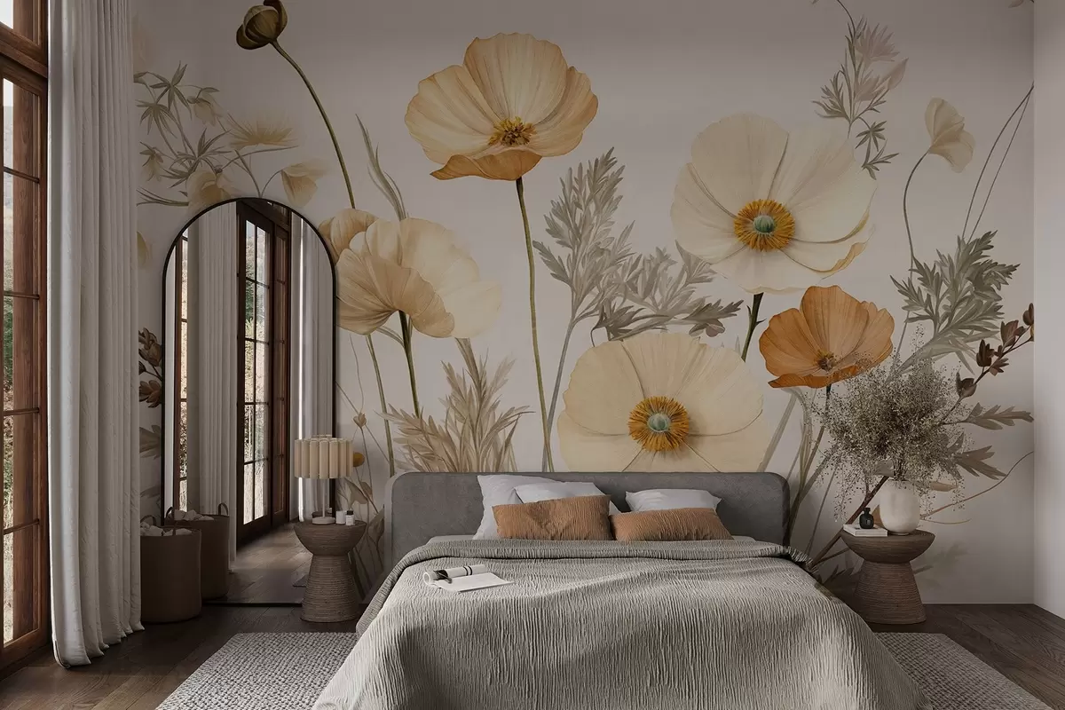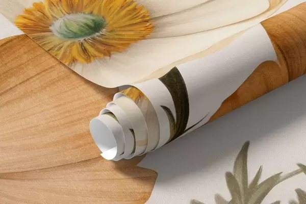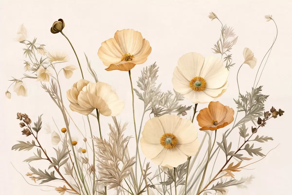 Papel de pared Amapolas naranjas y blancas de textura vintage con tallos y hojas finas, fondo beige claro, estilo acuarela Nr. w09293