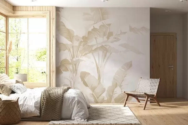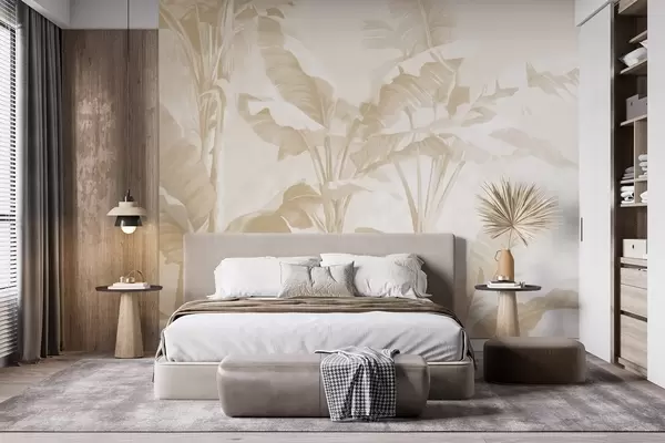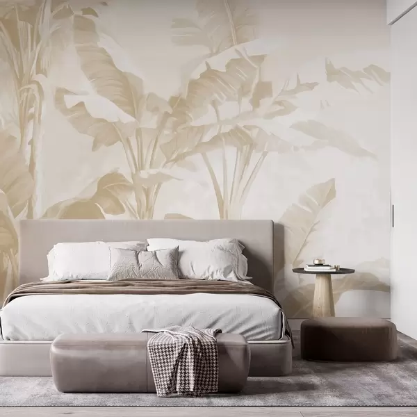 murales Hojas de plátano tropical en suaves tonos beige w09311v2