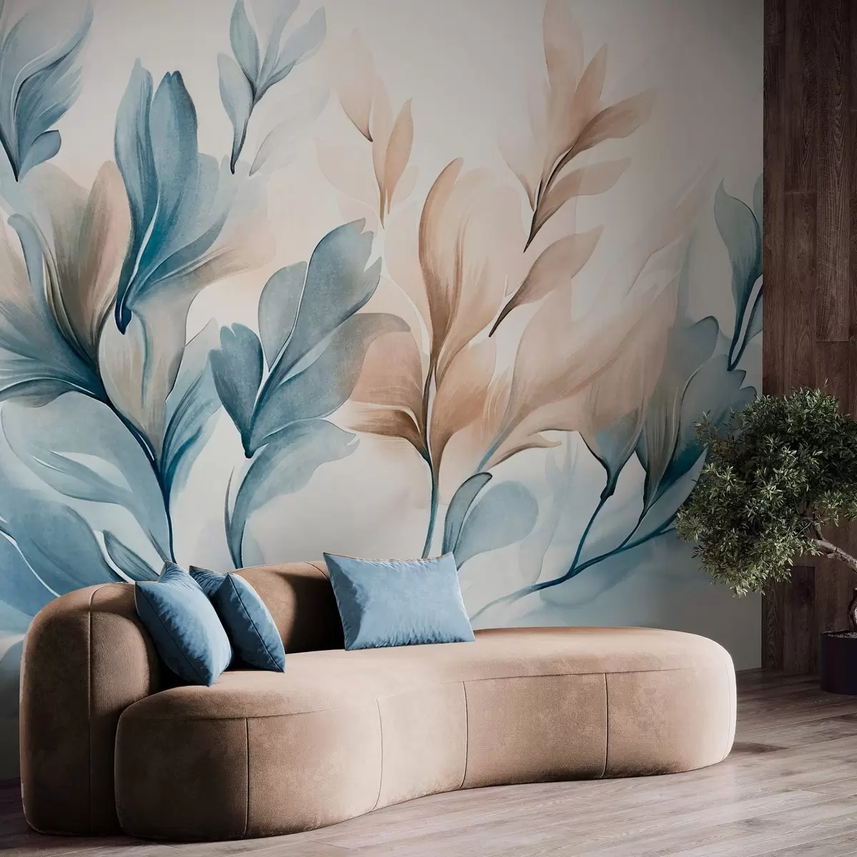 Papel de pared Hojas abstractas azules y marrones con pinceladas visibles , ligeras y texturizadas, paleta de colores suaves, efecto acuarela Nr. w09313