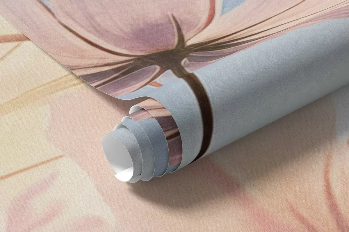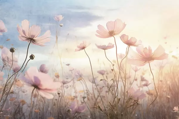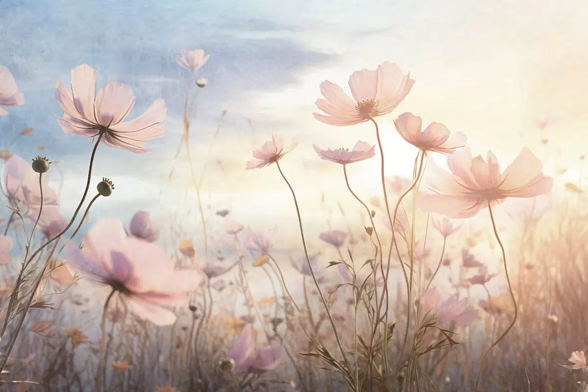 Papel de pared Un campo de flores de textura rosa con tallos largos, contra un suave cielo azul y amarillo, creando una atmósfera de ensueño Nr. w09320