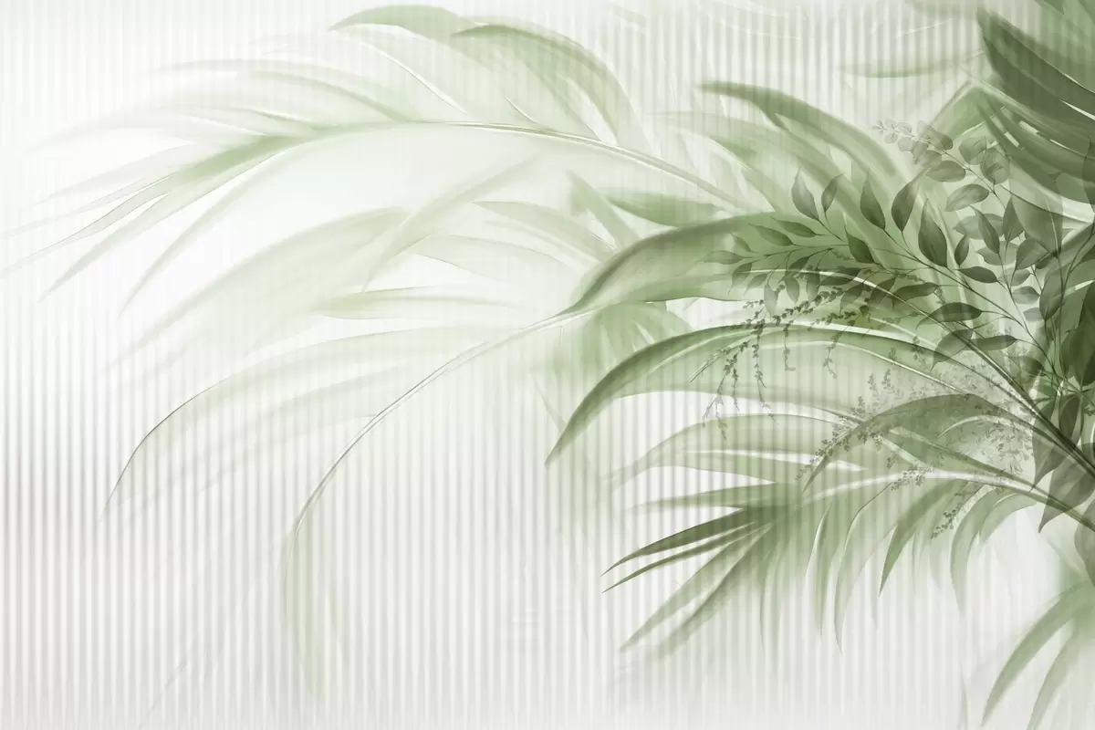 murales Palmera tropical de hojas verdes con fondo blanco a rayas, iluminación suave, pinceladas delicadas, formas orgánicas w09343