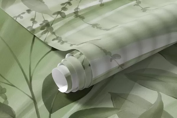 Papel de pared Palmera tropical de hojas verdes con fondo blanco a rayas, iluminación suave, pinceladas delicadas, formas orgánicas Nr. w09343