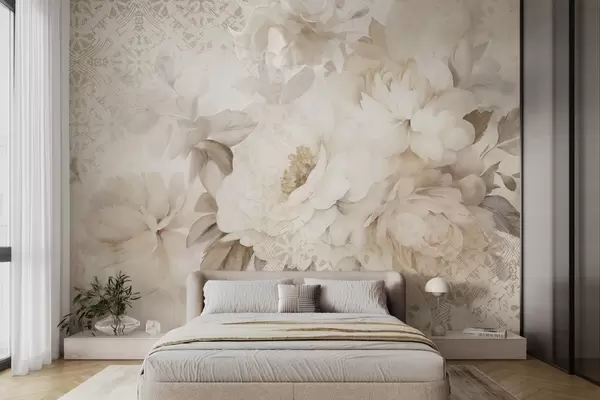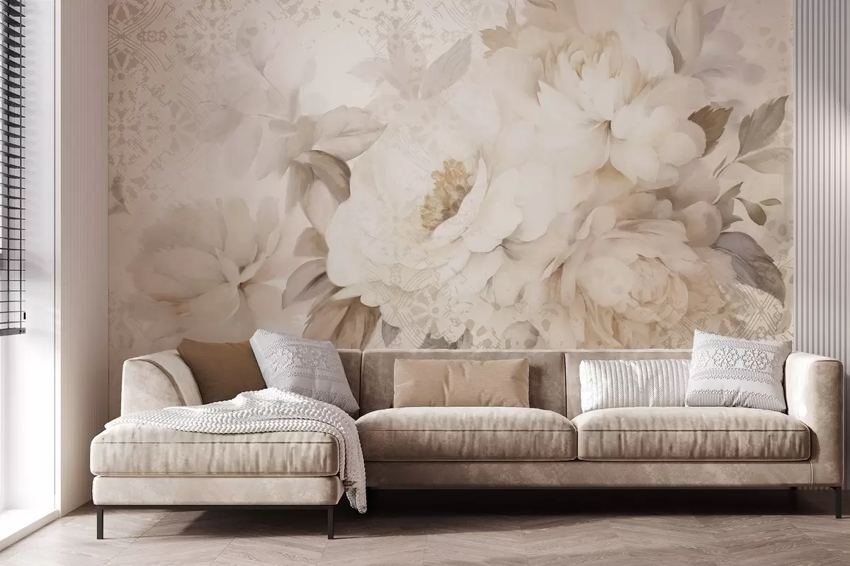 Papel de pared Un arreglo floral de peonías blancas con hojas beige, sobre un fondo decorativo con textura vintage Nr. w09345