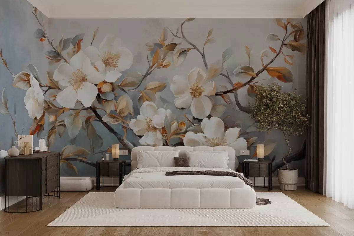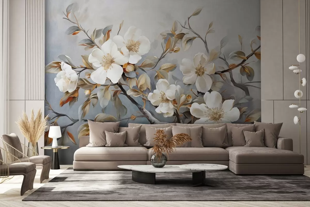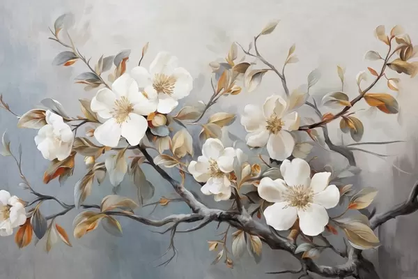 Papel de pared Flores blancas con pistilos amarillos en una rama de árbol con hojas, fondo claro, estilo de pintura vintage, impresión texturizada Nr. w09368