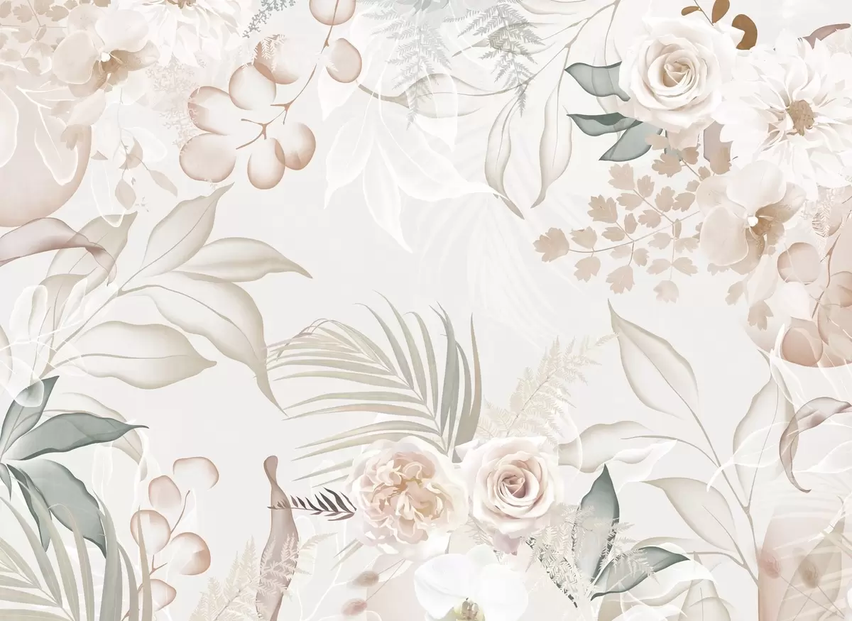 Papel de pared Arreglo floral con textura, compuesto por rosas, orquídeas, eucalipto y hojas de palmera en colores pastel, con fondo beige Nr. w09393