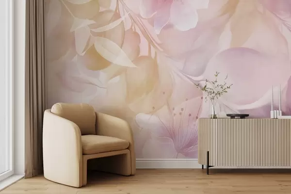 Papel de pared Arte floral con flores, hojas y ramas en tonos amarillos y morados apagados, colores pastel suaves y efecto texturizado de acuarela Nr. w09397v2