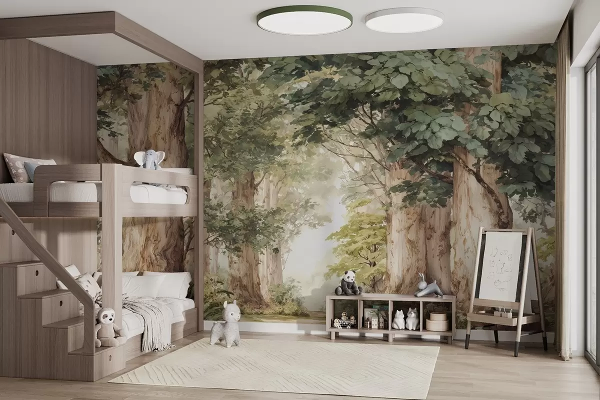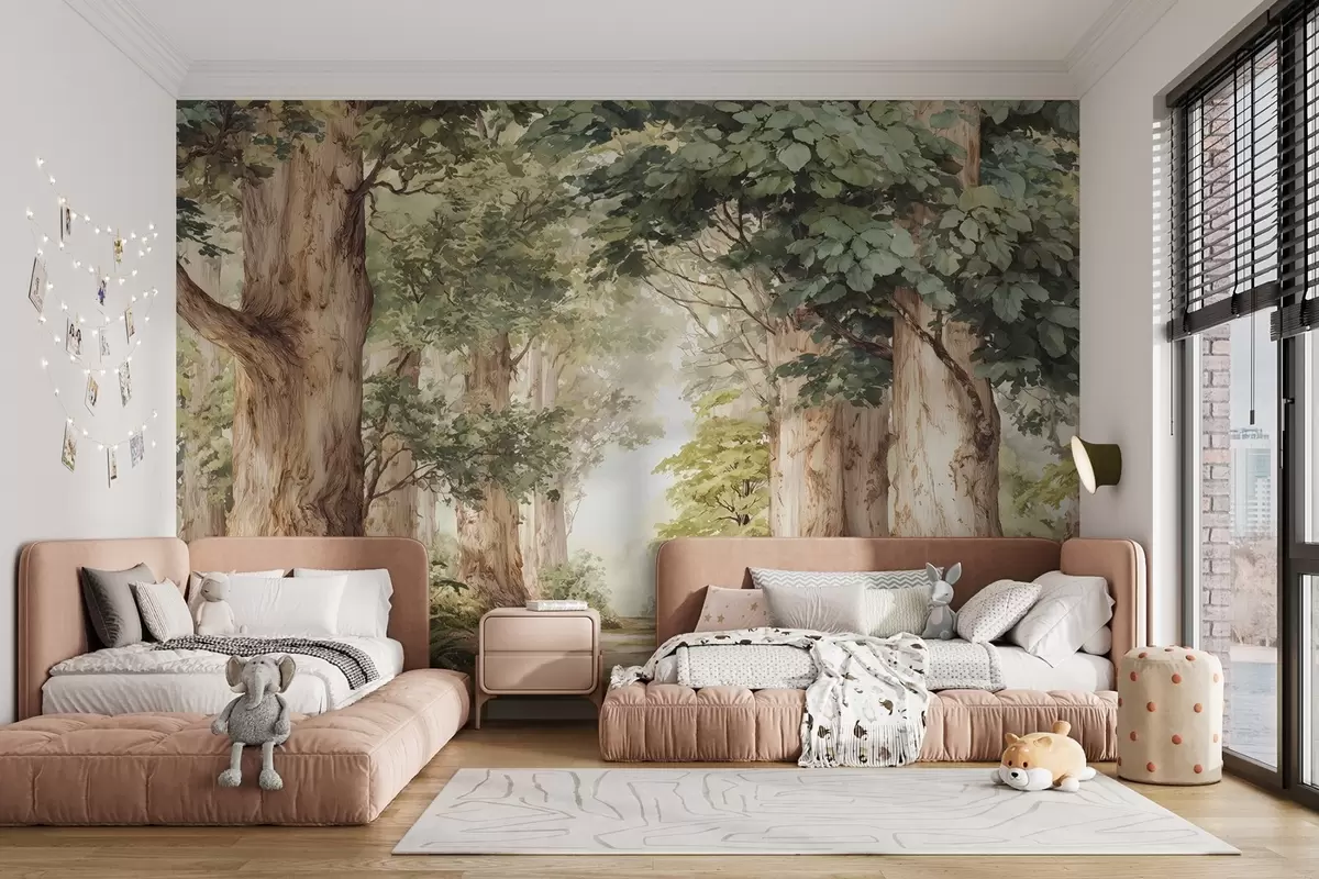 Papel de pared Sendero forestal entre majestuosos árboles en estilo acuarela Nr. w09404