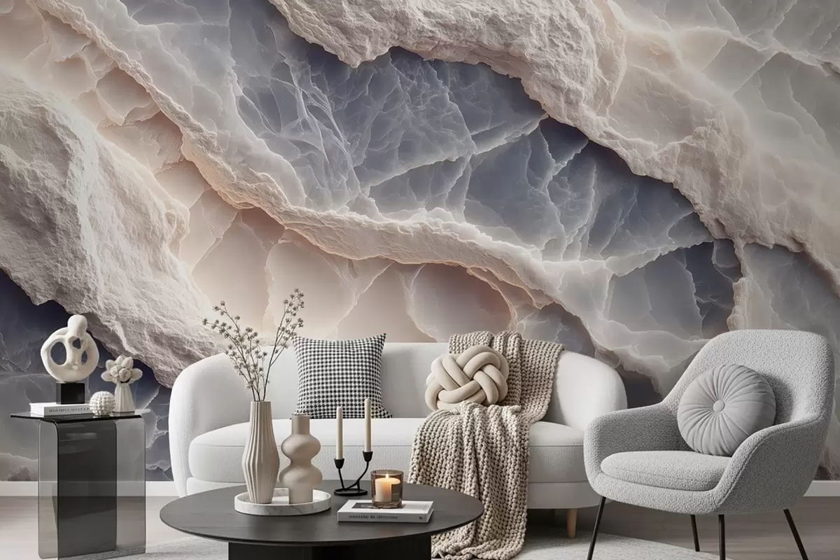 Papel de pared Elegante abstracción al estilo de capas de mármol y minerales en color azul-beige Nr. w09408