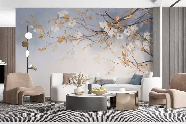 Papel de pared Flores blancas con hojas naranjas en una rama de árbol, fondo azul claro con textura, delicadas pinceladas Nr. w09415