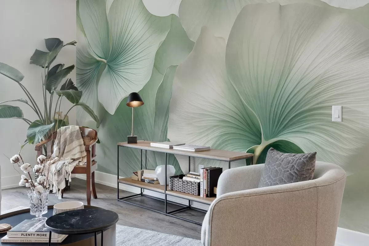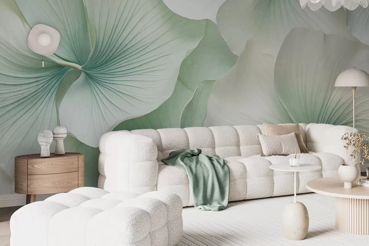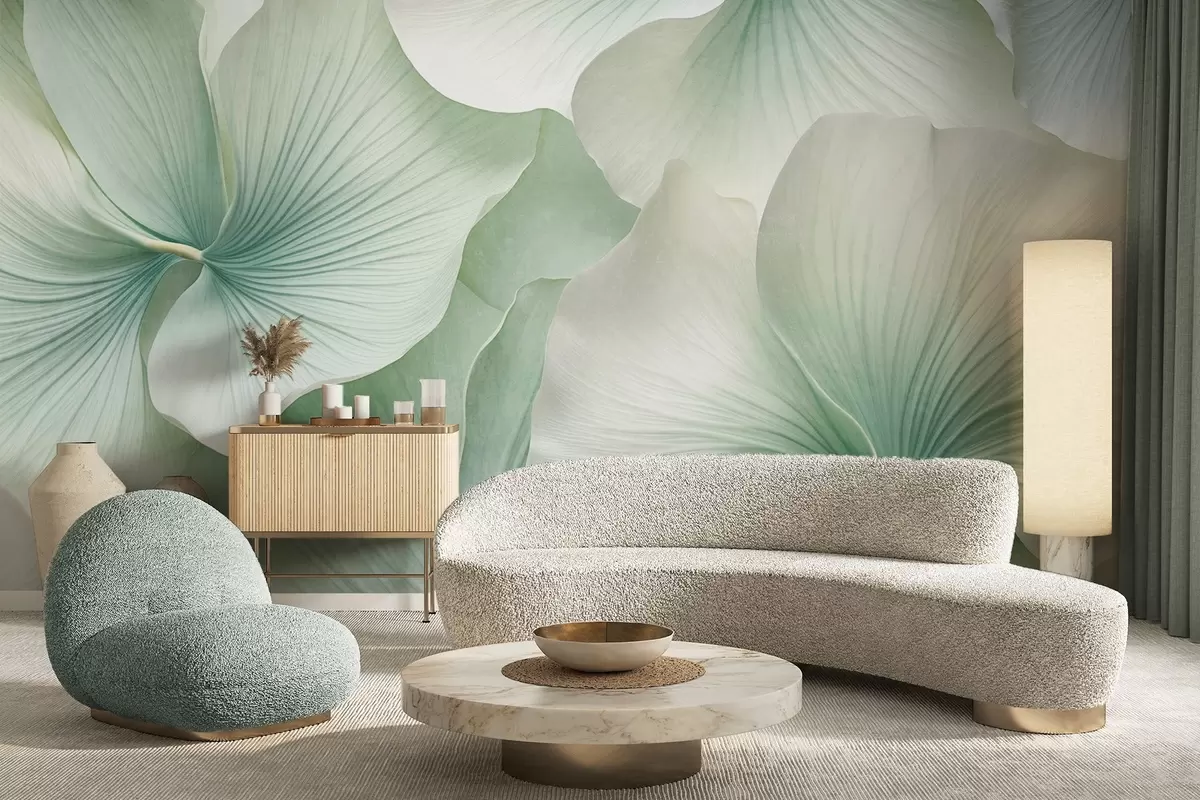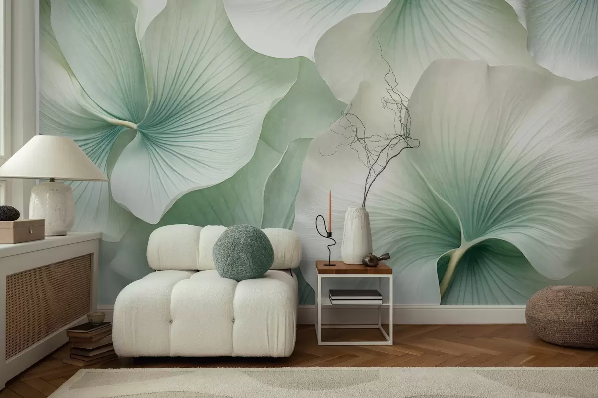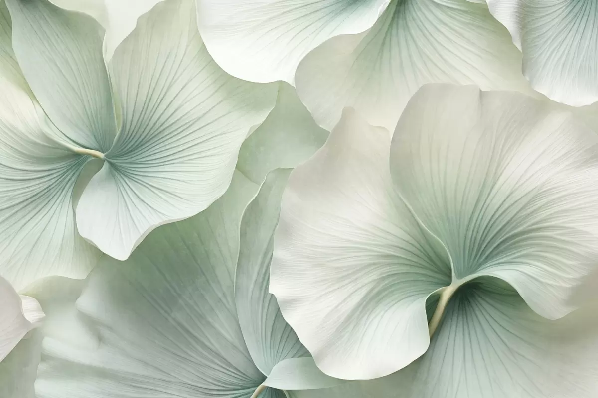 Papel de pared Hojas de ginkgo blancas y verdes, textura suave, fondo floral abstracto, estilo minimalista moderno Nr. w09421