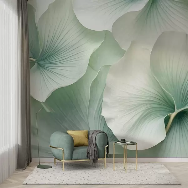 Papel de pared Hojas de ginkgo blancas y verdes, textura suave, fondo floral abstracto, estilo minimalista moderno Nr. w09421