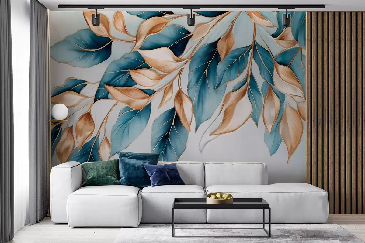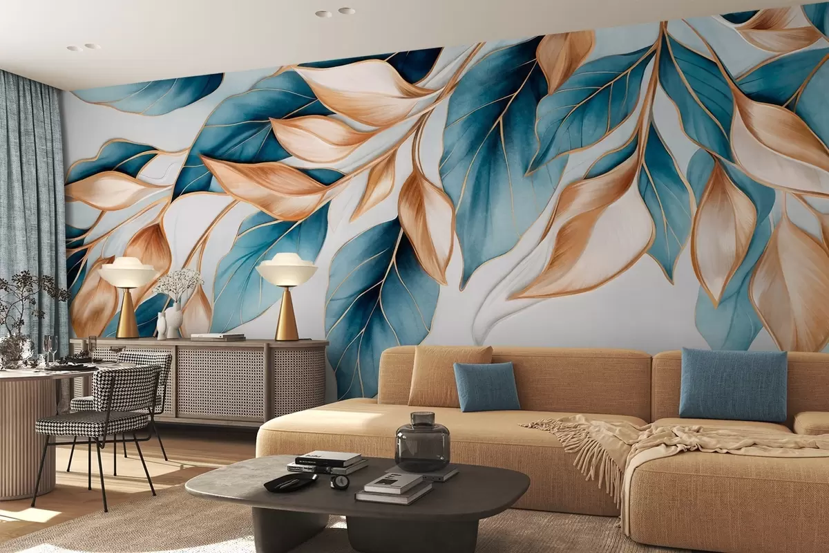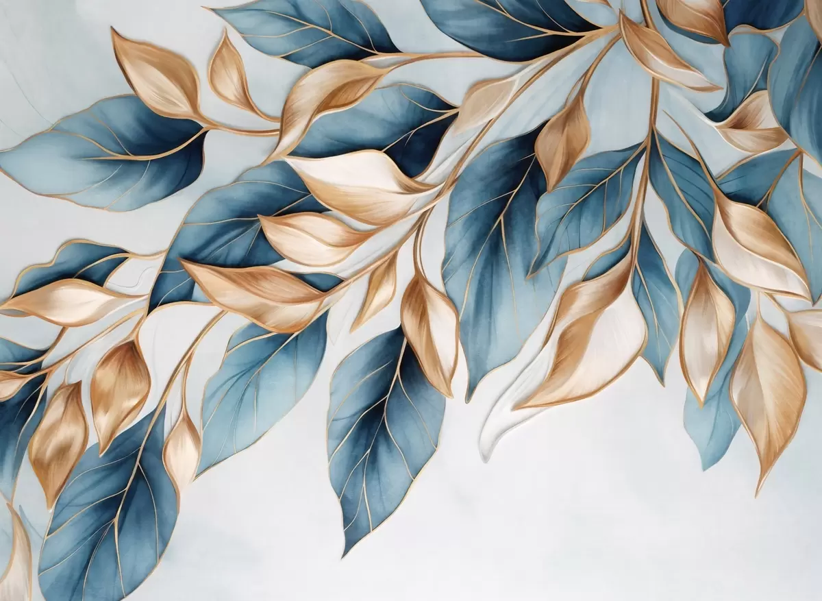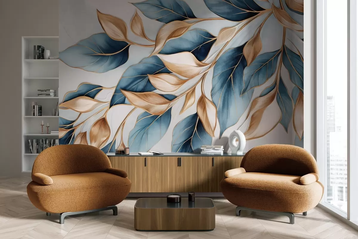 Papel de pared Hojas azules y naranjas con textura, fondo azul claro, diseño elegante y artístico, estilo moderno. Nr. w09429