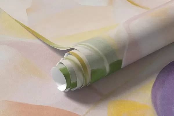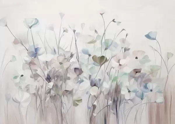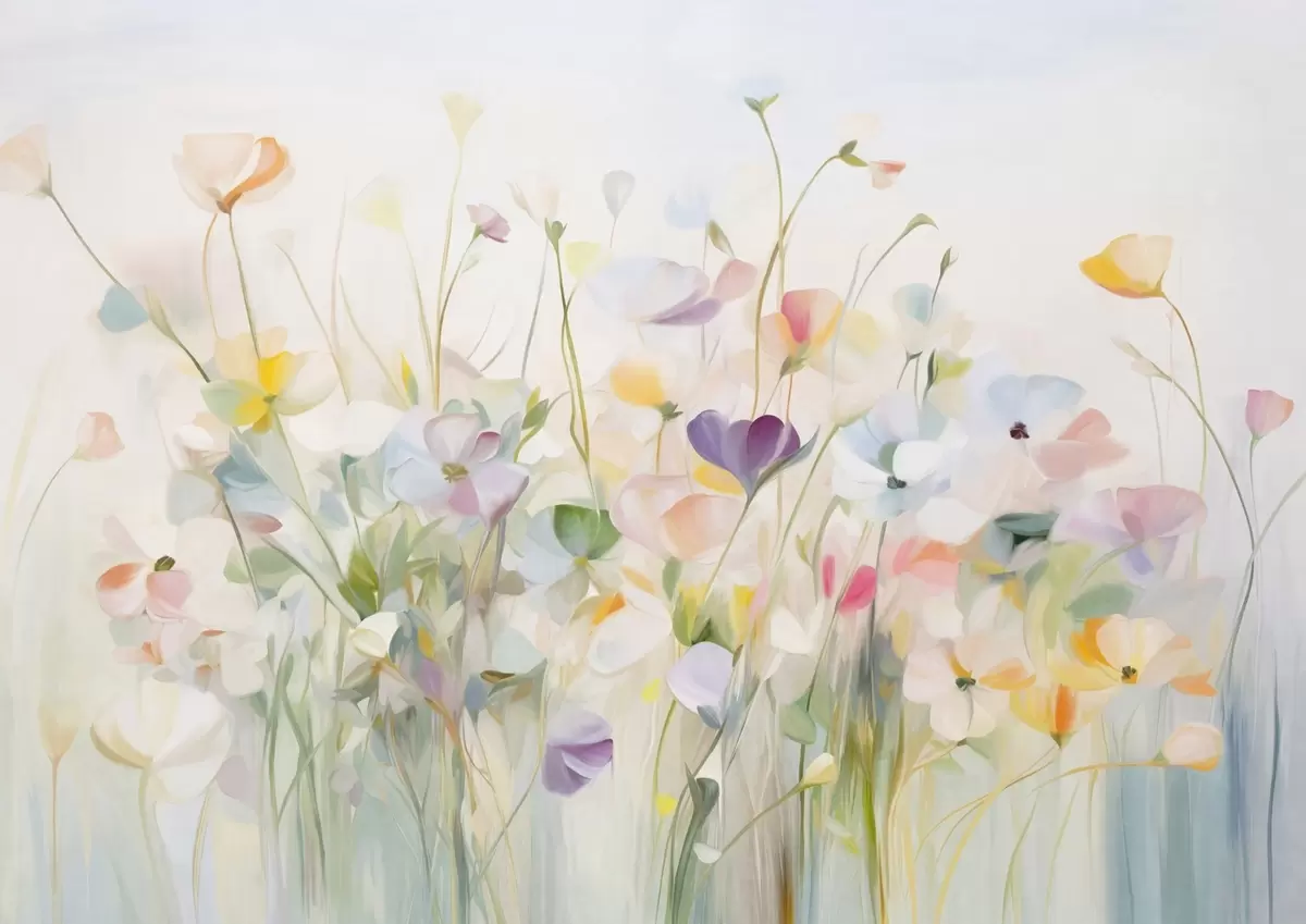 Papel de pared Campo abstracto de flores coloridas con tallos largos y hojas verdes, texturizado, colores pastel y claros Nr. w09466