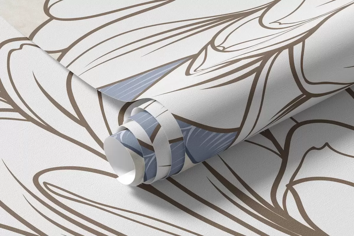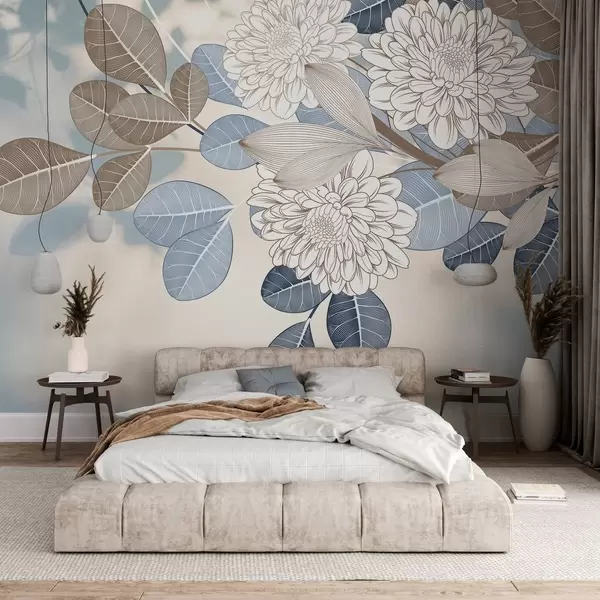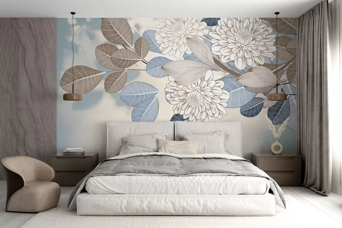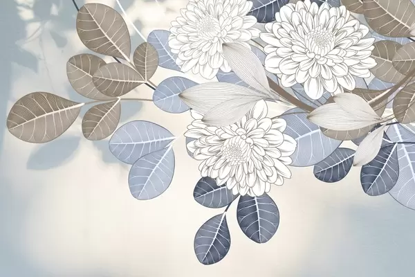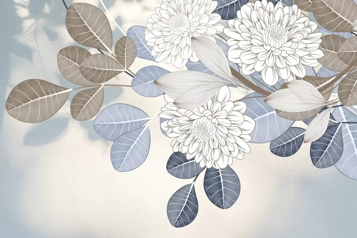 Papel de pared Flores blancas con hojas azules y marrones, fondo azul claro con textura, arreglo floral, dibujo lineal detallado Nr. w09496