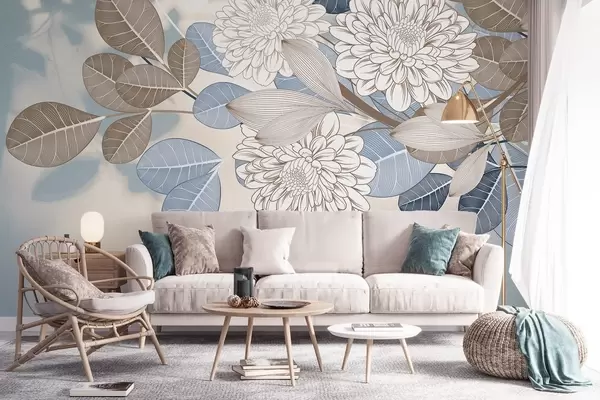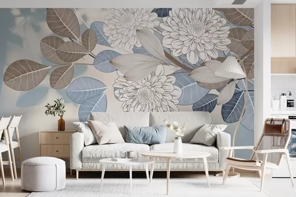 Papel de pared Flores blancas con hojas azules y marrones, fondo azul claro con textura, arreglo floral, dibujo lineal detallado Nr. w09496