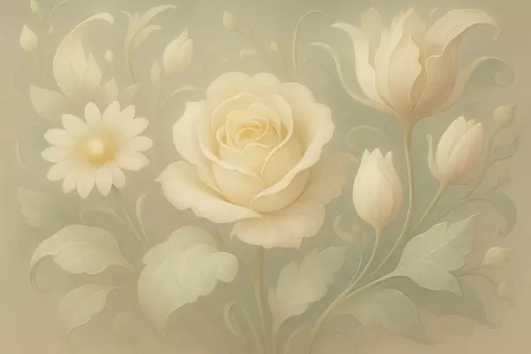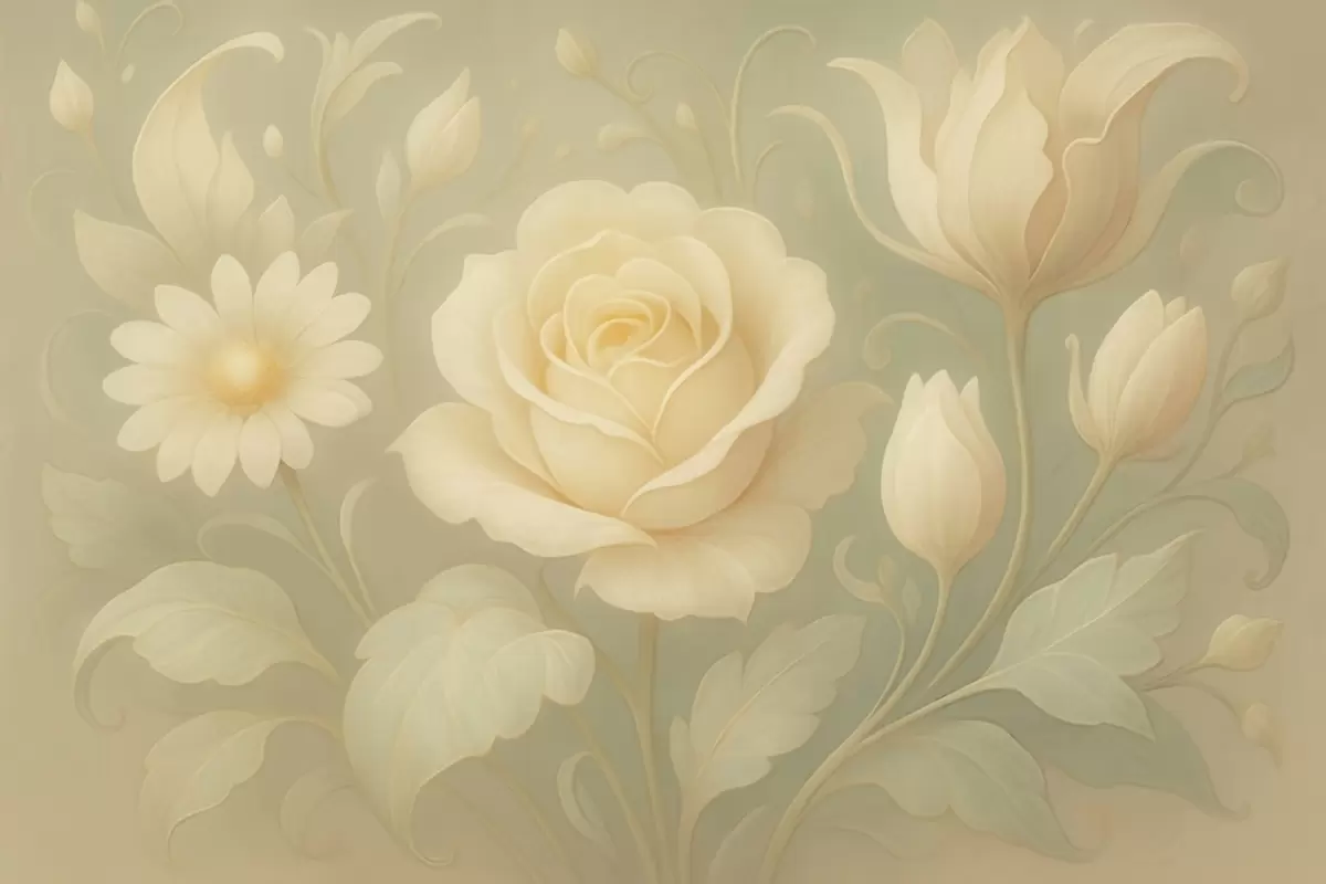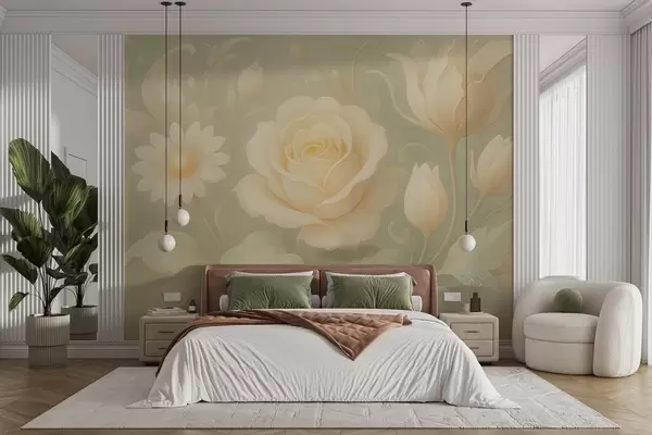 Papel de pared Delicada composición vintage con rosas beige sobre fondo verde claro. Nr. w09499