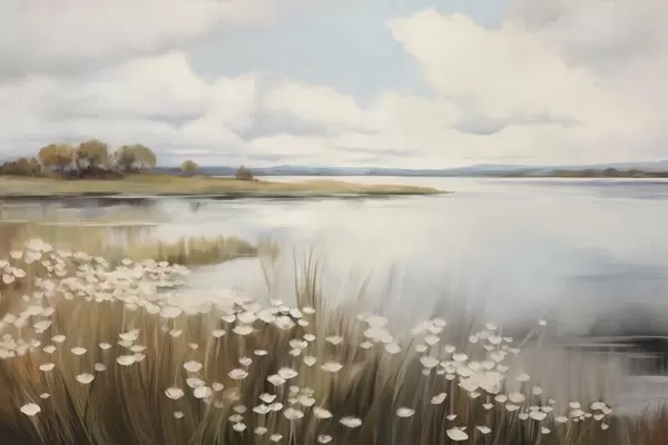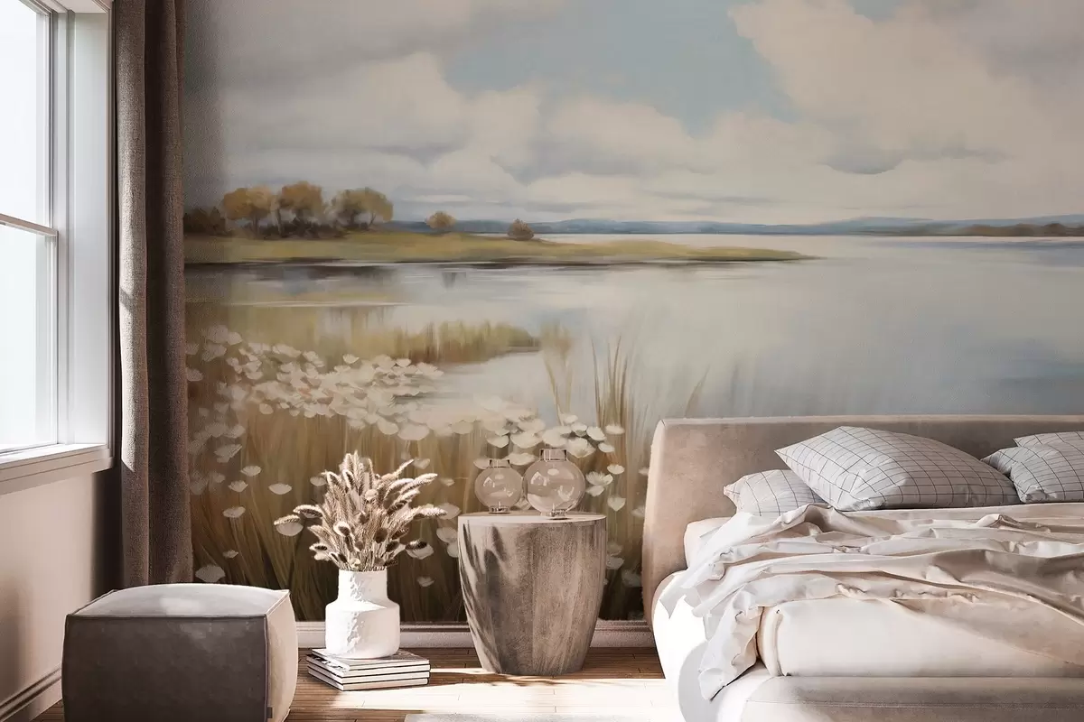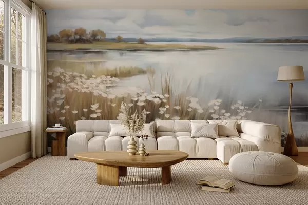Papel de pared Paisaje con textura, campo de flores blancas y hierba alta, un lago al fondo, una colina cubierta de hierba con árboles, colores suaves. Nr. w09530