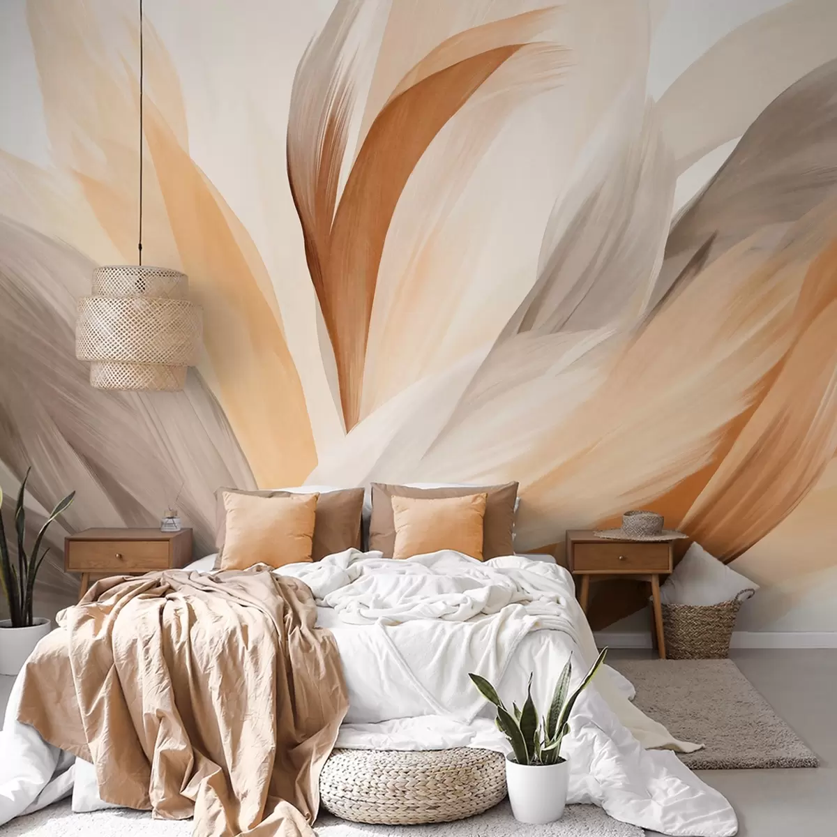 Papel de pared Plumas abstractas con textura en marrón, blanco y gris y varios tonos, superpuestas sobre un fondo blanco. Nr. w09531