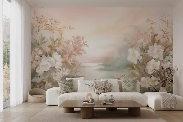Papel de pared Un paisaje con un río rodeado de flores y plantas, colores suaves, cielo rosado, estilo con textura de acuarela. Nr. w09537