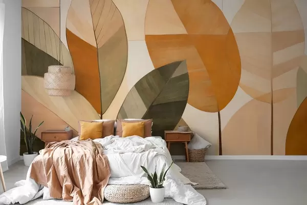 Papel de pared Hojas abstractas grandes en tonos naranjas, marrones y verdes, con textura, dispuestas sobre un fondo claro. Nr. w09539