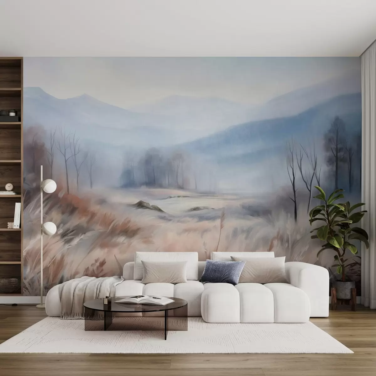 Papel de pared Paisaje con textura, con hierba seca en primer plano y árboles al fondo, con montañas en la distancia. Nr. w09542