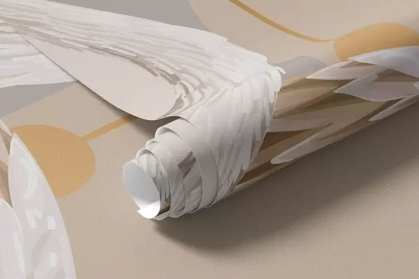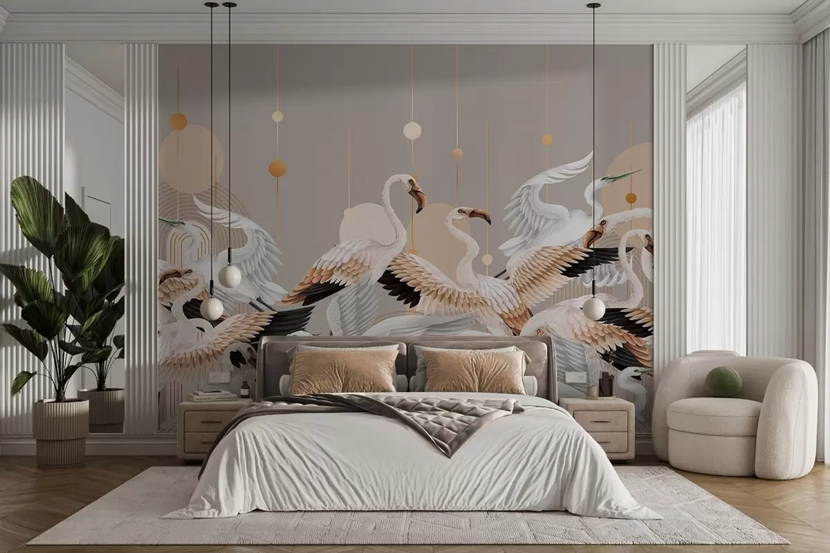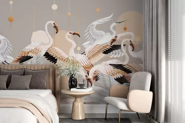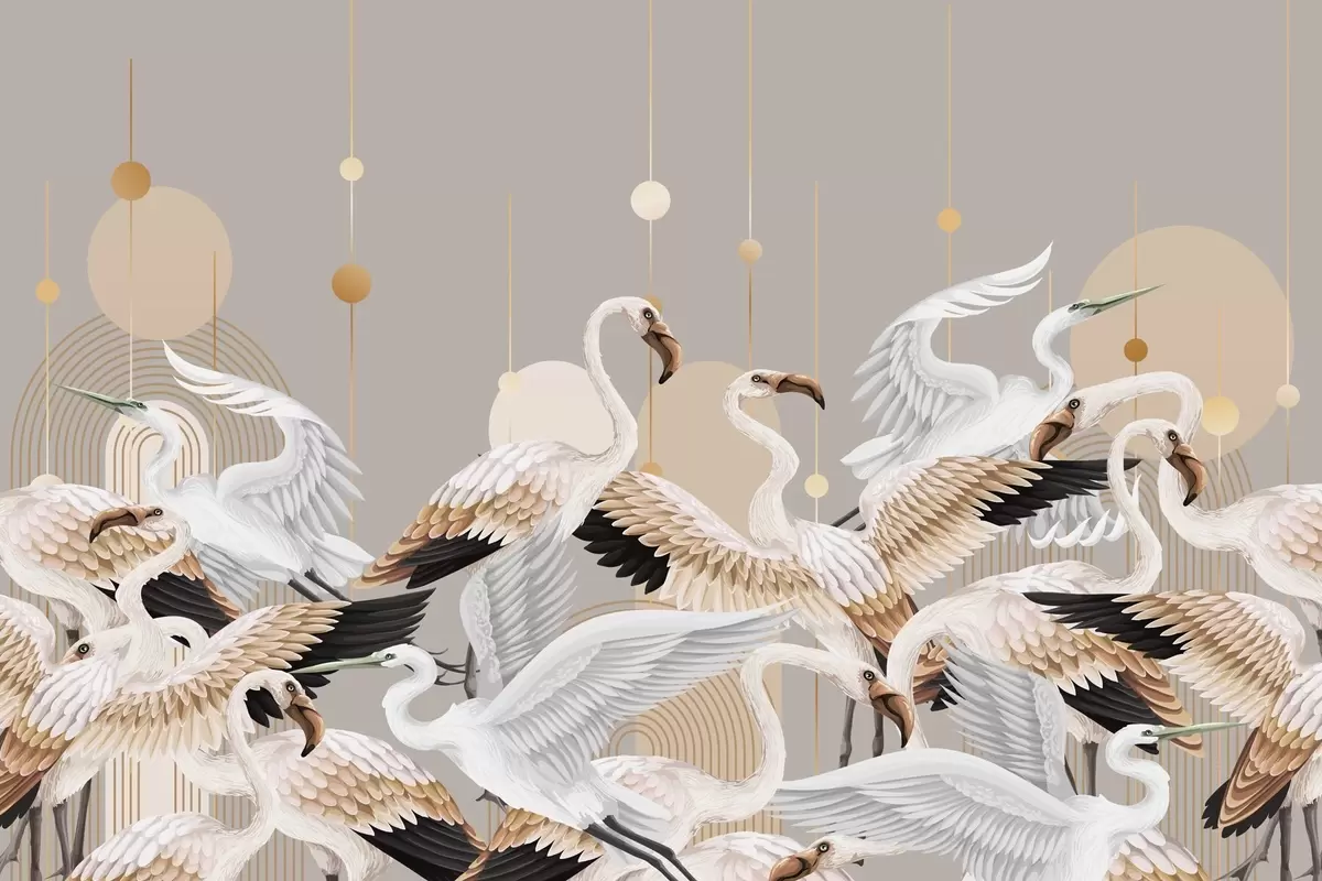 Papel de pared Una bandada de flamencos blancos con delicadas alas, sobre un fondo neutro con líneas y círculos amarillos. Nr. w09546v1