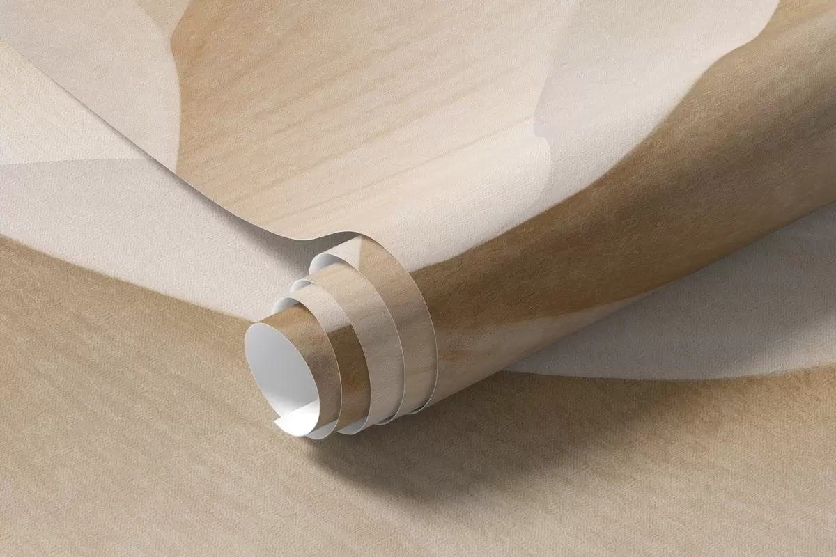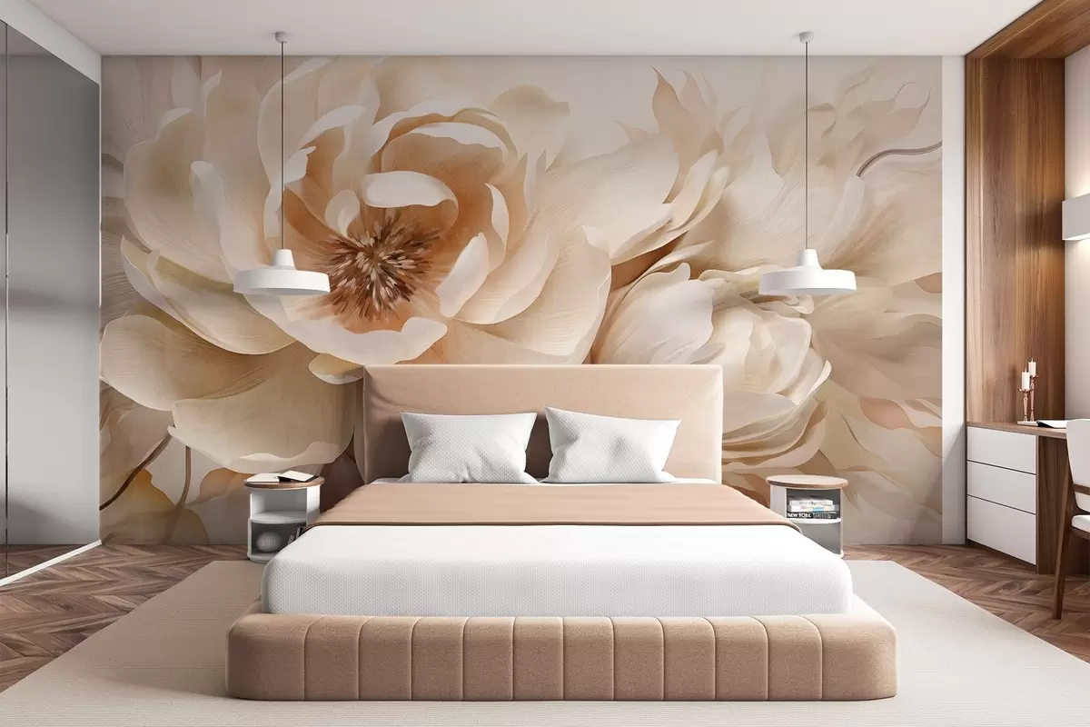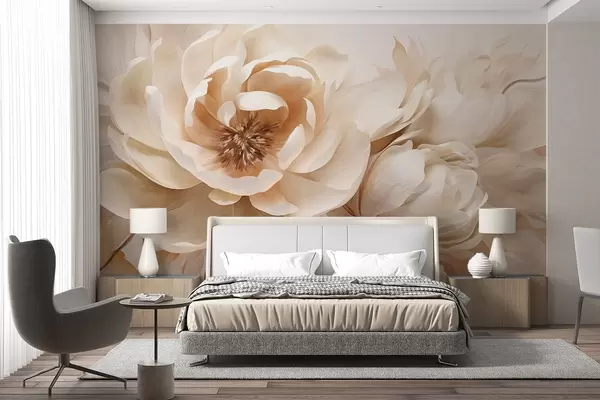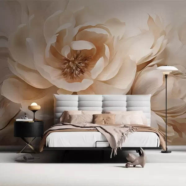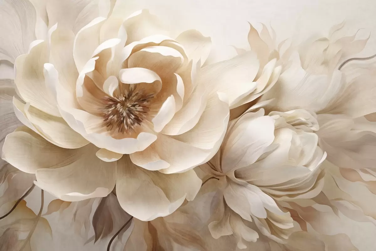 Papel de pared Peonías de textura cremosa con centros marrones y hojas sobre un fondo abstracto difuminado y claro. Nr. w09554