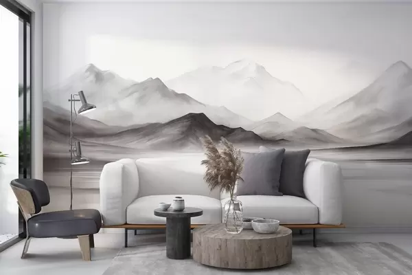 Papel de pared Un paisaje monocromático con textura, montañas brumosas y un lago en primer plano. Nr. w09555