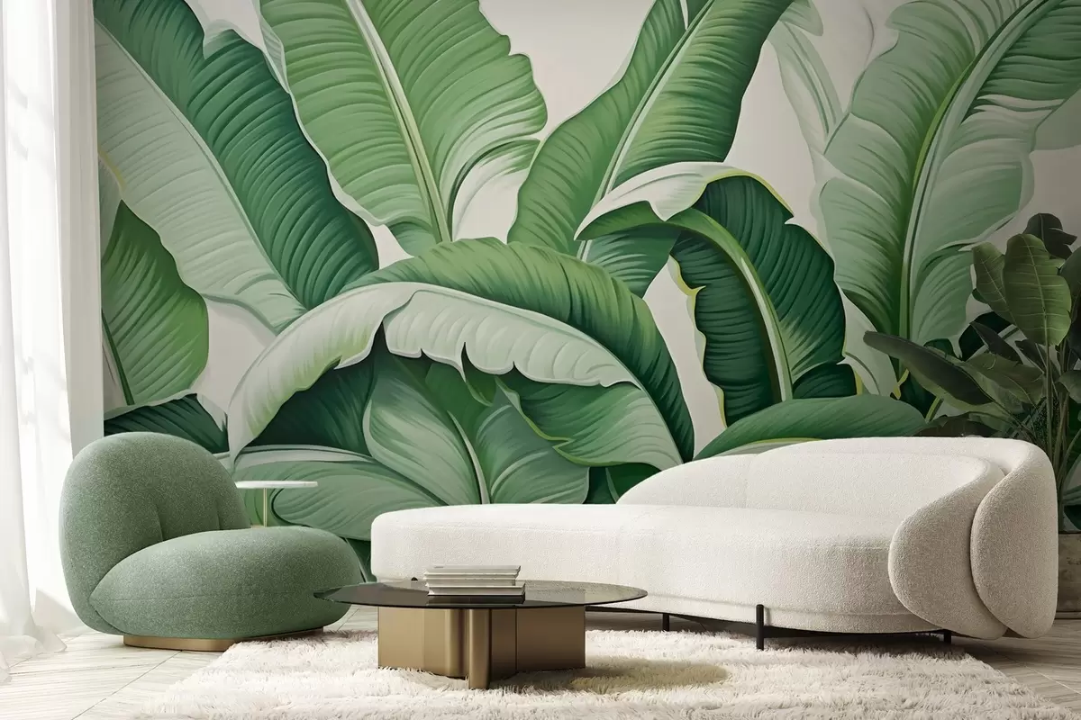 Papel de pared Hojas de plátano tropicales verdes con efecto 3D. Nr. w09559