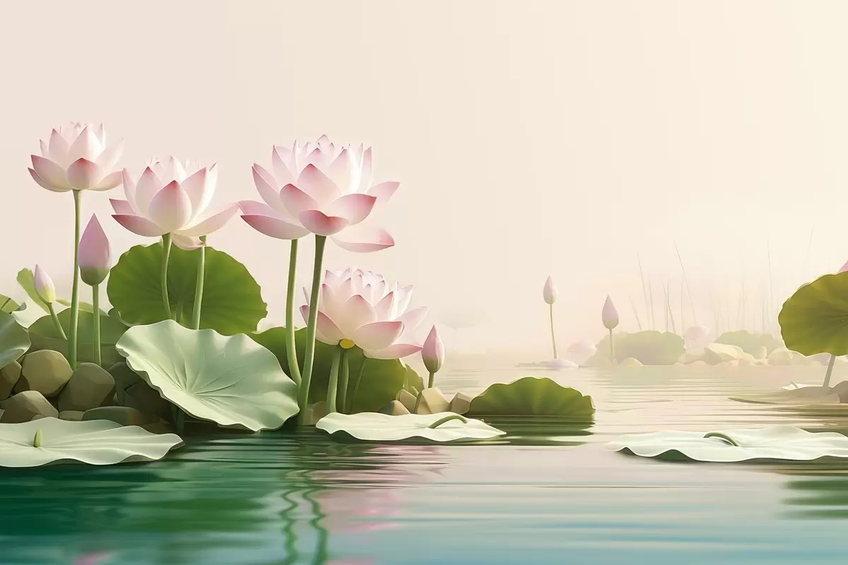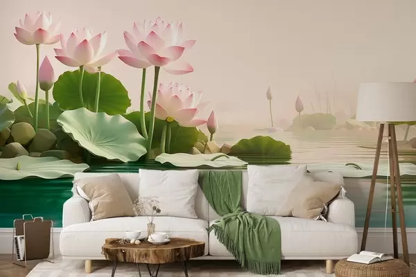 Papel de pared Flores de loto rosadas sobre el agua, un tranquilo paisaje tropical. Nr. w09561