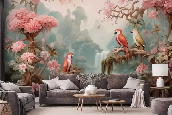 Papel de pared Un bosque tropical de cuento de hadas con loros, árboles en flor con flores rosas y una cascada. Nr. w09580