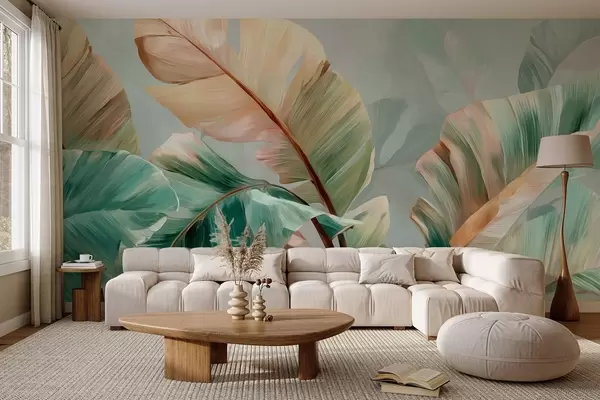 Papel de pared Delicadas hojas tropicales de plátano en tonos pastel amarillo verdosos. Nr. w09581