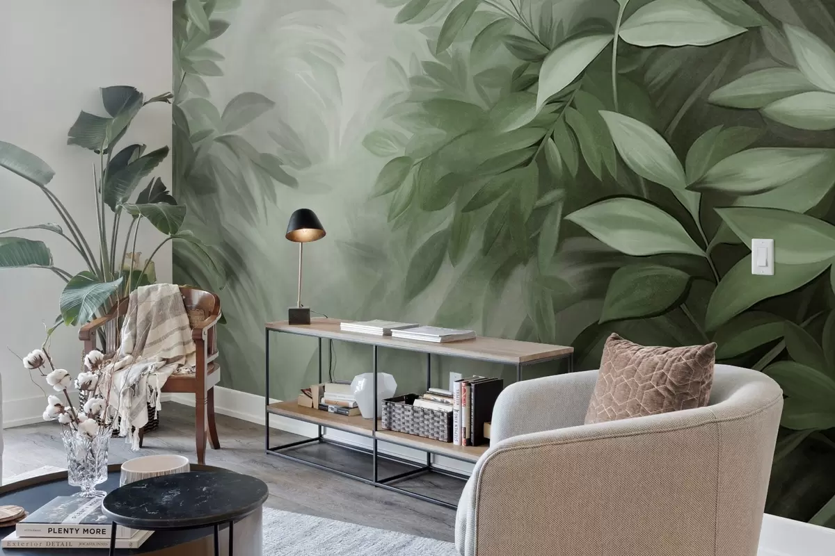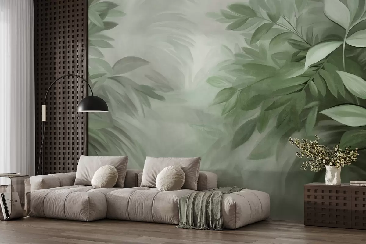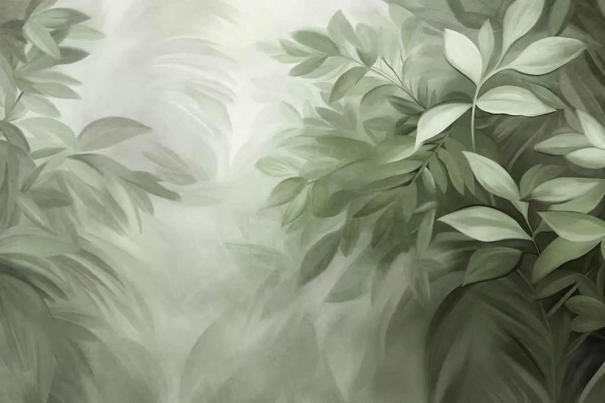 Papel de pared Hojas verdes y grises con un follaje de textura suave y difuminada, en un estilo pictórico con pinceladas visibles. Nr. w09584v1