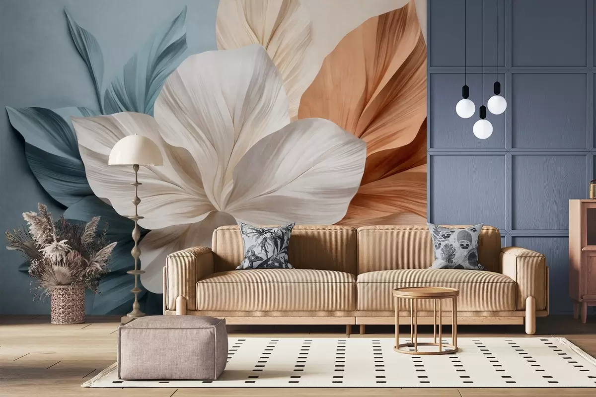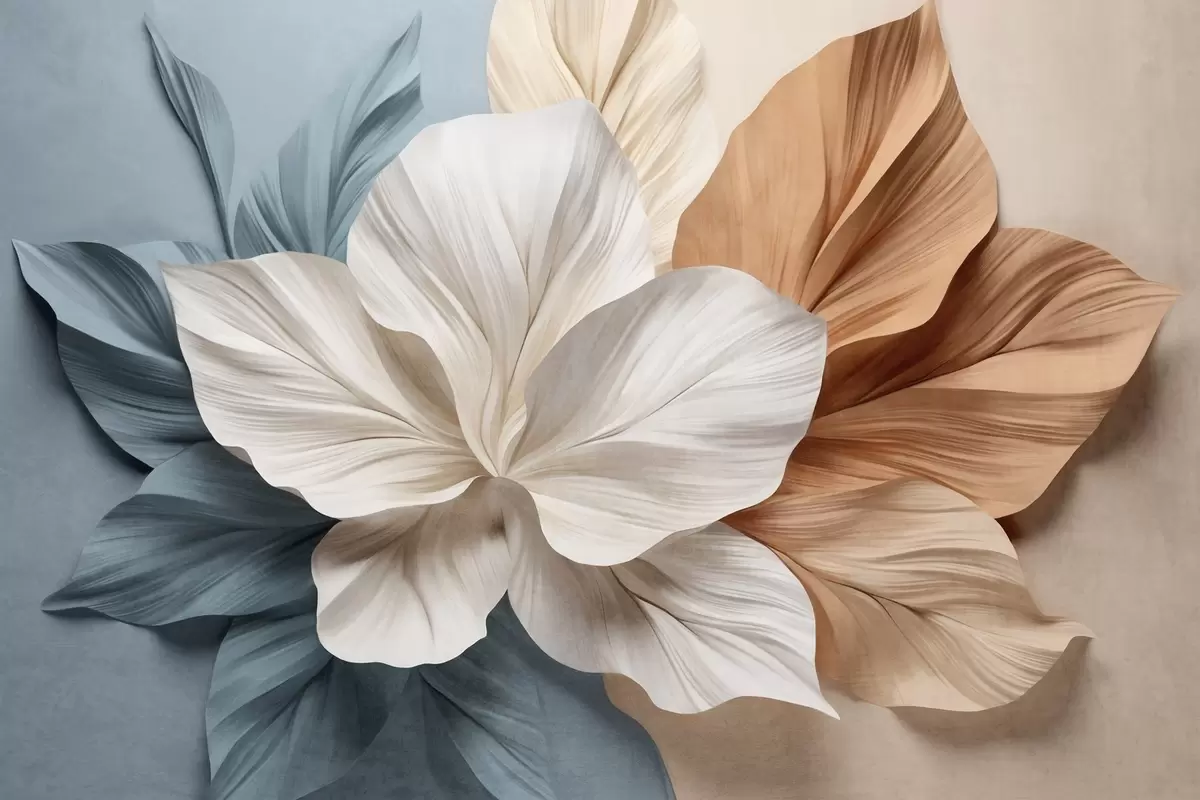 Papel de pared Flor abstracta de múltiples pétalos con hojas texturizadas en tonos melocotón y azul, fondo suave. Nr. w09604