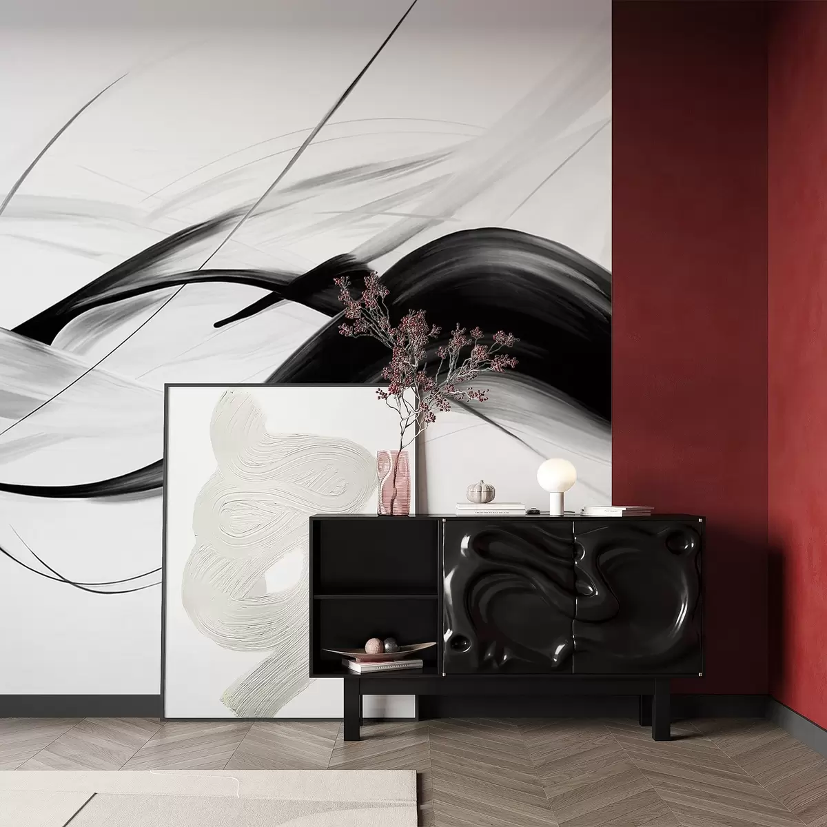 Papel de pared Pinceladas abstractas en blanco y negro con líneas finas que crean un diseño moderno sobre un fondo claro. Nr. w09605